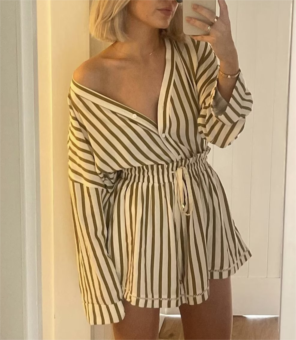 Spring Women Clothing Beige Stripes Top Short Two Piece Set