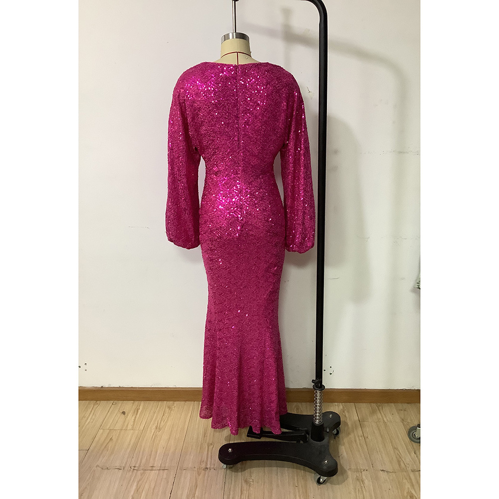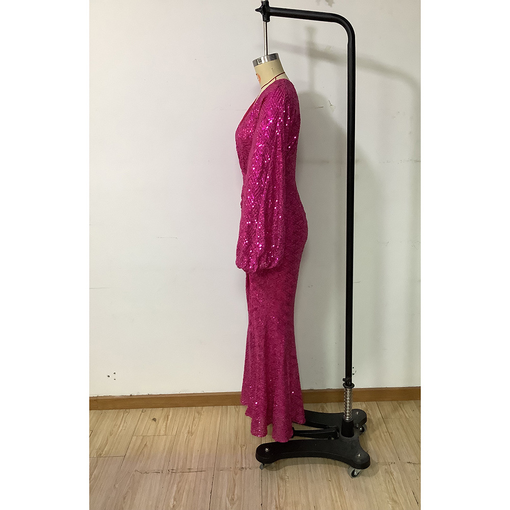 Spring Women Clothing Elegant Dress Sequ Deep V Plunge Split Long Sleeve Maxi Dress