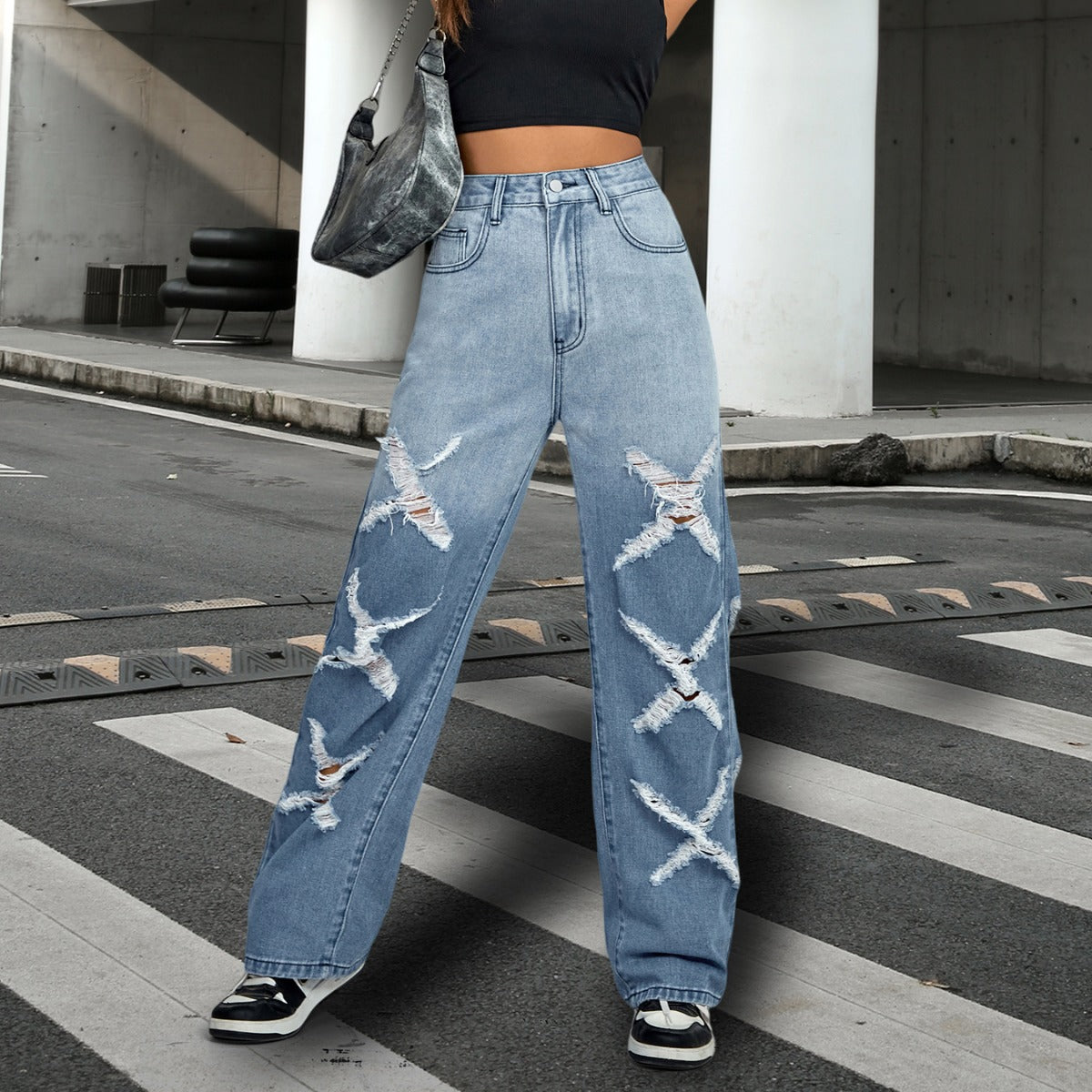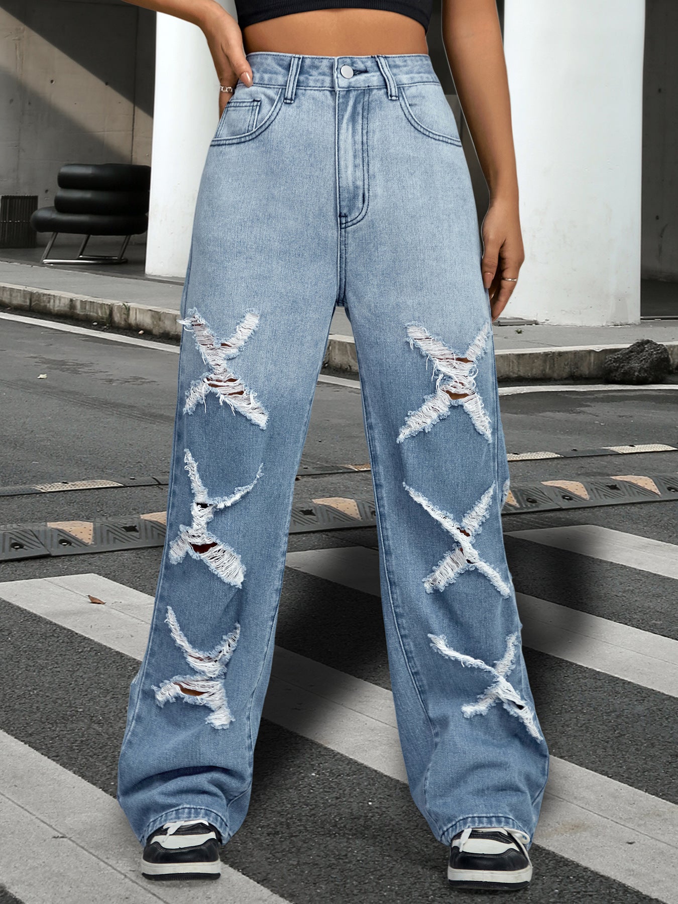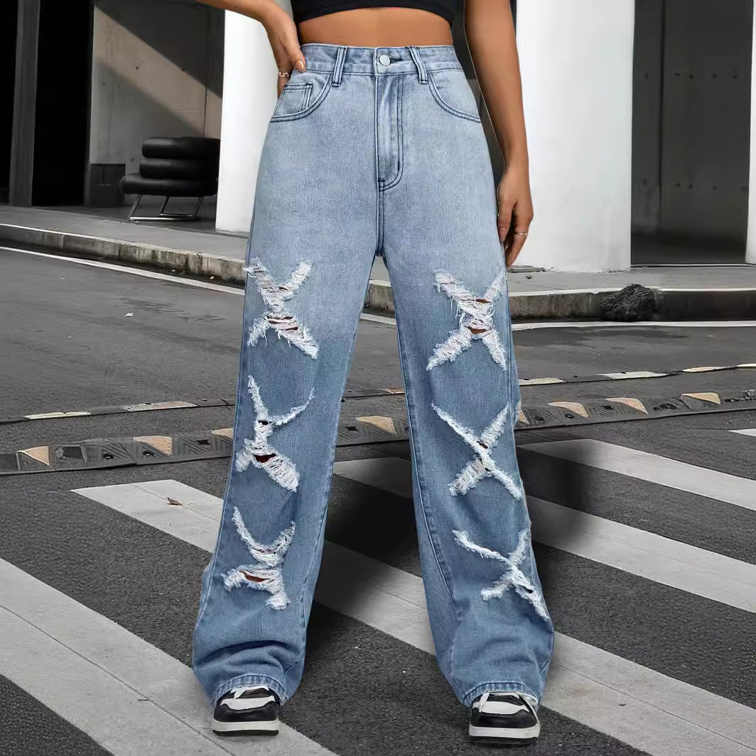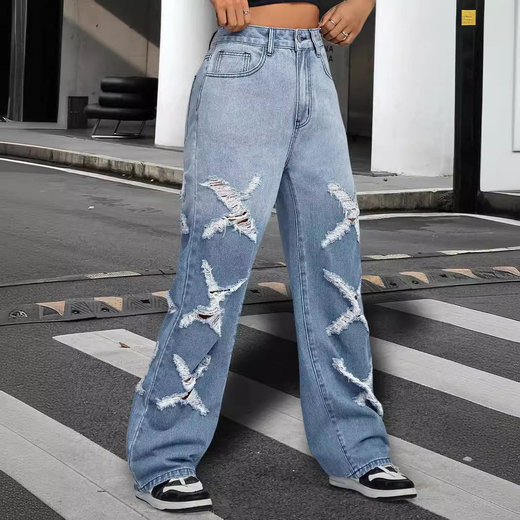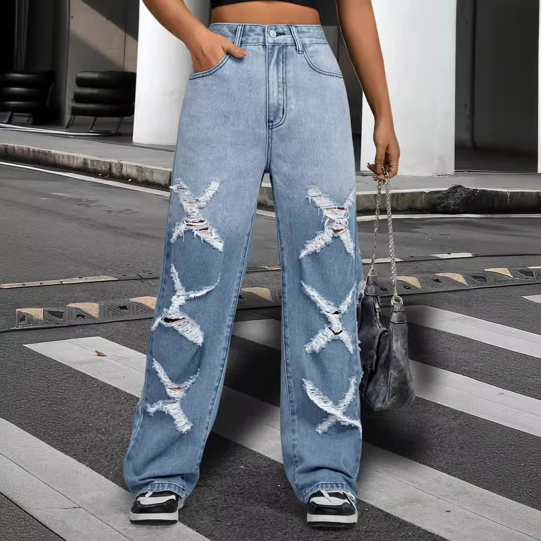 Straight Pants Water Washed Hole Wide Leg Pants Jeans Women