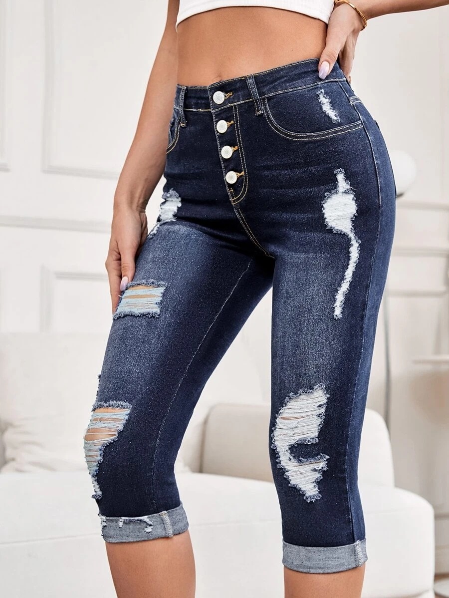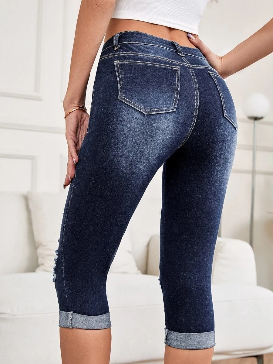 Stretch Feet Pants Mid Waist Cropped Pants Ripped Jeans Women Pants