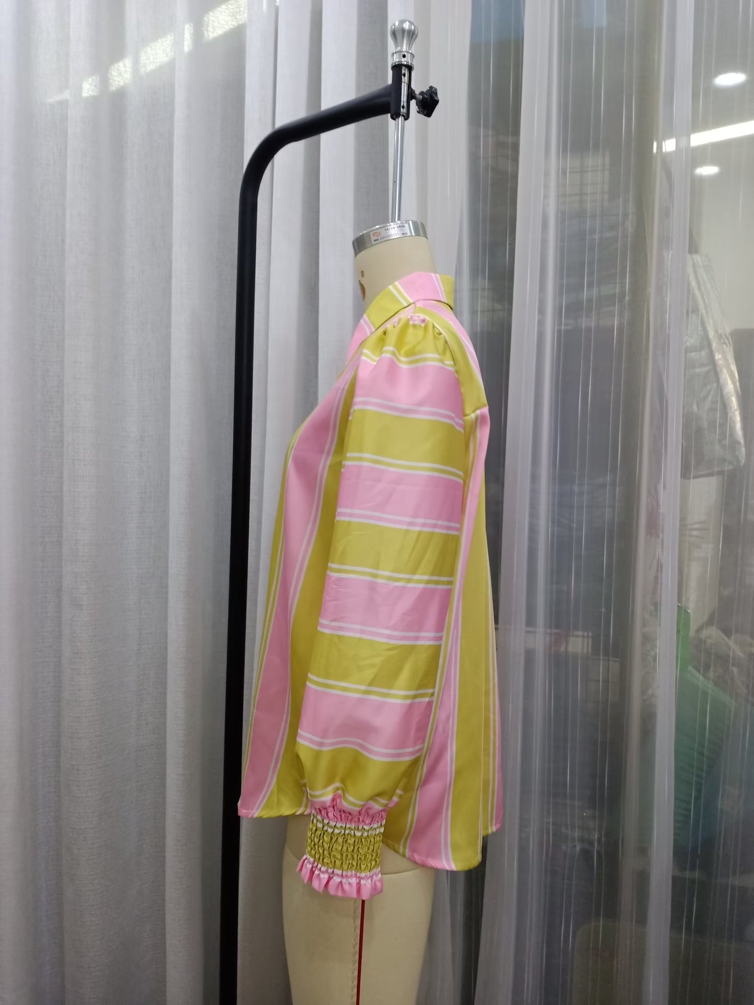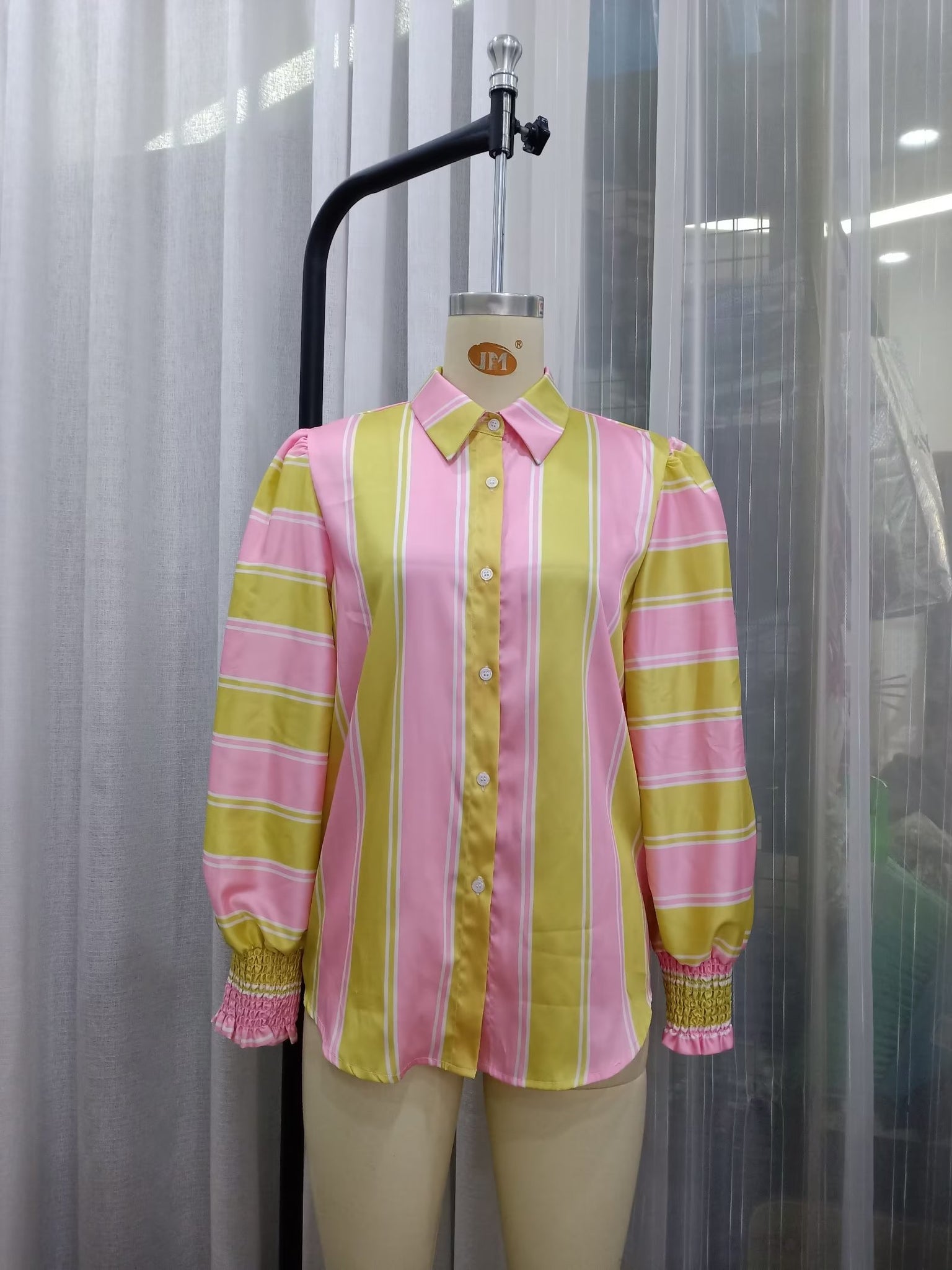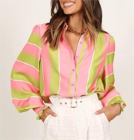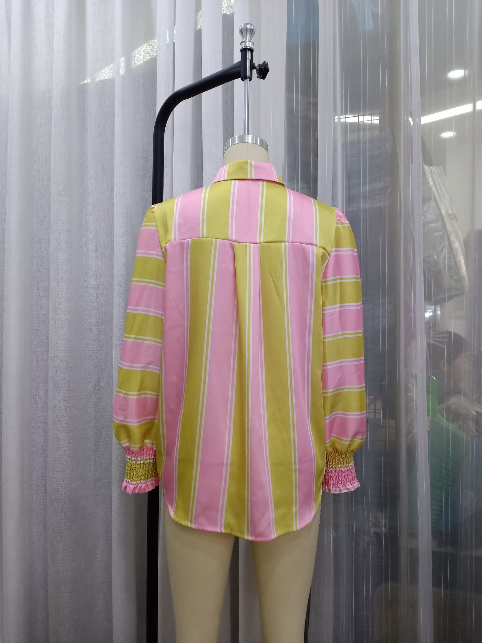 Striped Loose Top for Women Summer Elegant Collared Breasted Silk Satin Textured Long Sleeve Shirt