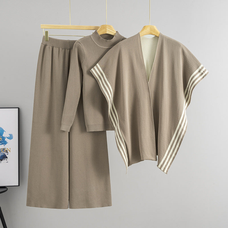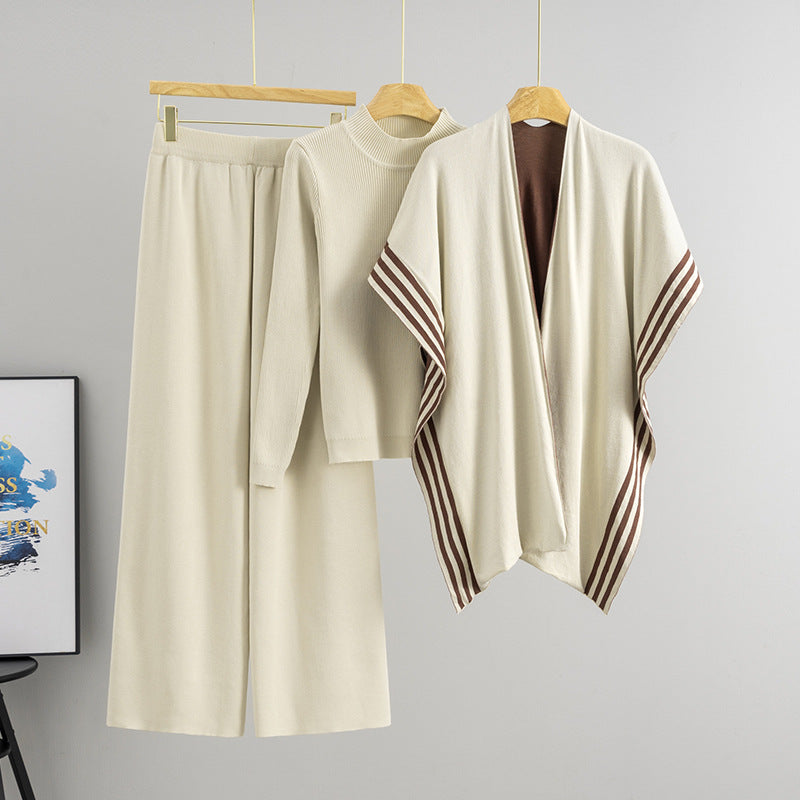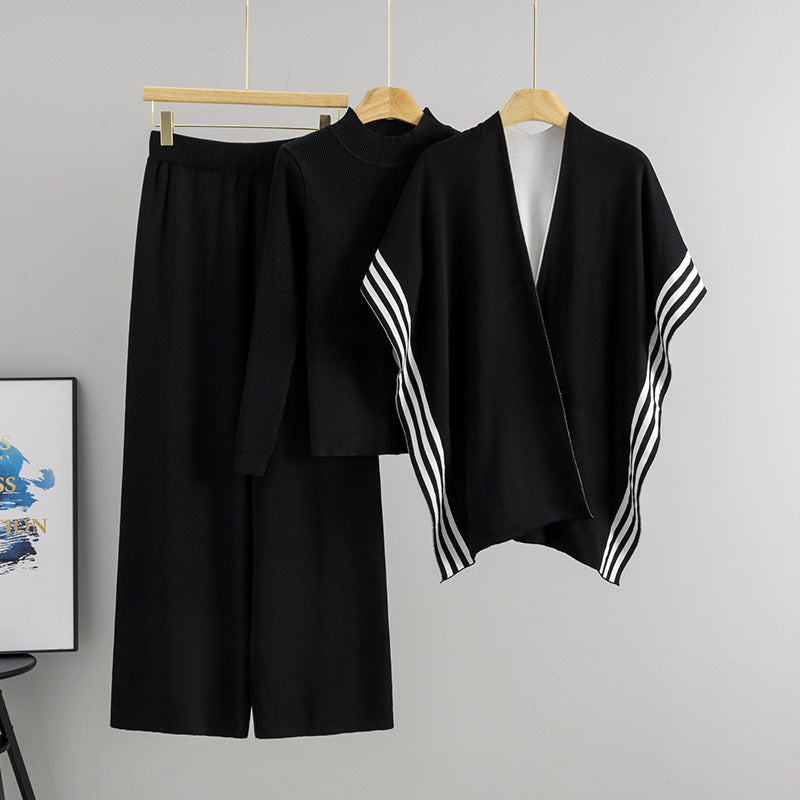 Striped Patchwork round Neck Loose Sweater Three Piece High Waist Straight Wide Leg Pants