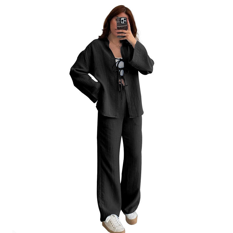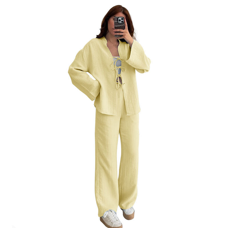 Summer Autumn Solid Color Tied Cardigan Long Sleeve Women Clothing Casual Trousers Two Piece Sets