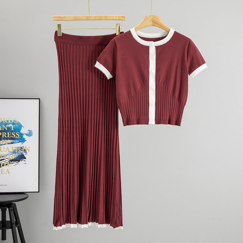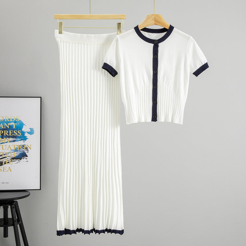 Summer Contrast Color U Collar Elastic Slim Fit Crop Top Half Length Suit Skirt Two Piece Sets