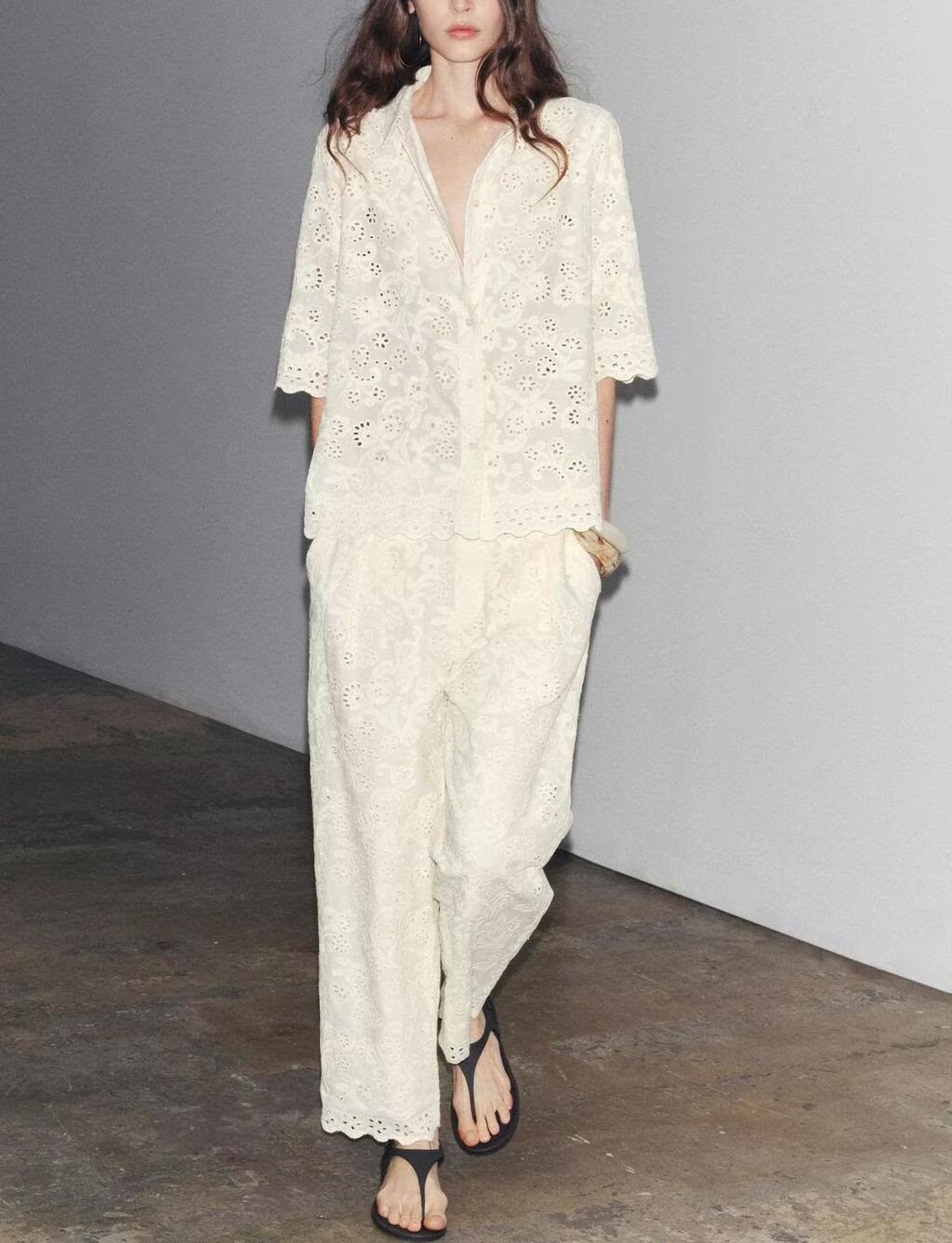 Summer Hollow Out Cutout Embroidered Shirt Pants Sets