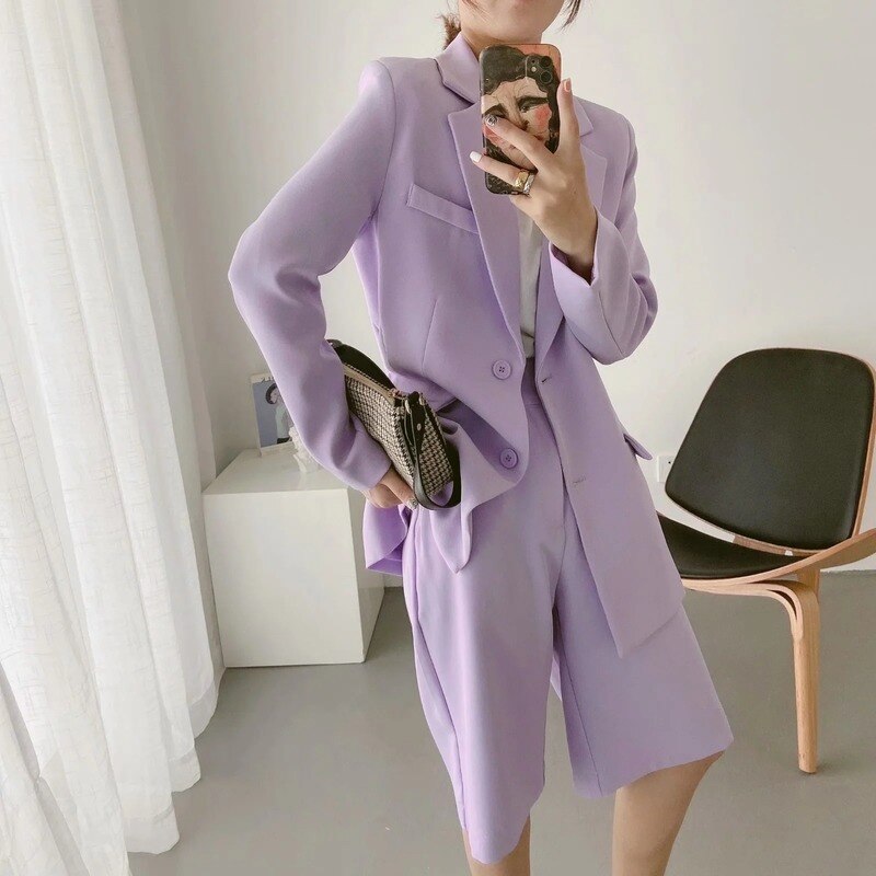 Summer Office Lady Blazer Suit Two Piece Set 2021 Women Single Breasted Casual Commute Blazer High Waist Wide Leg Shorts Suits|Pant Suits|