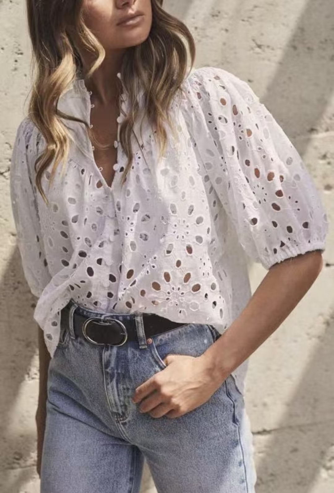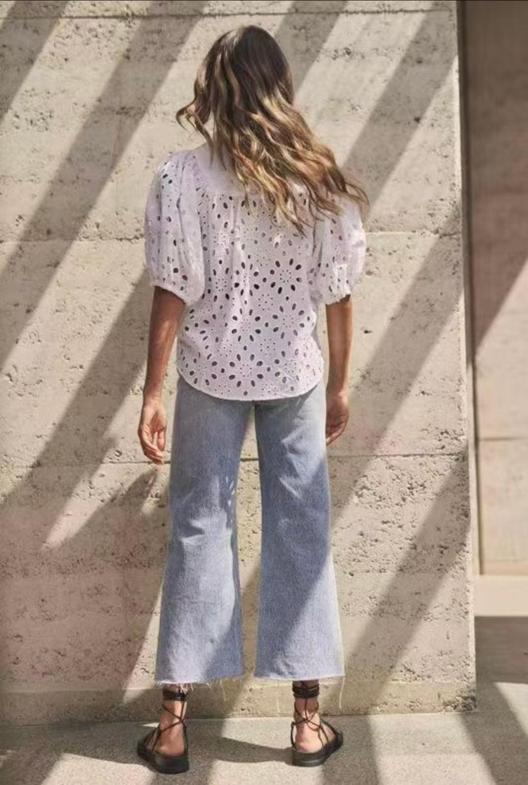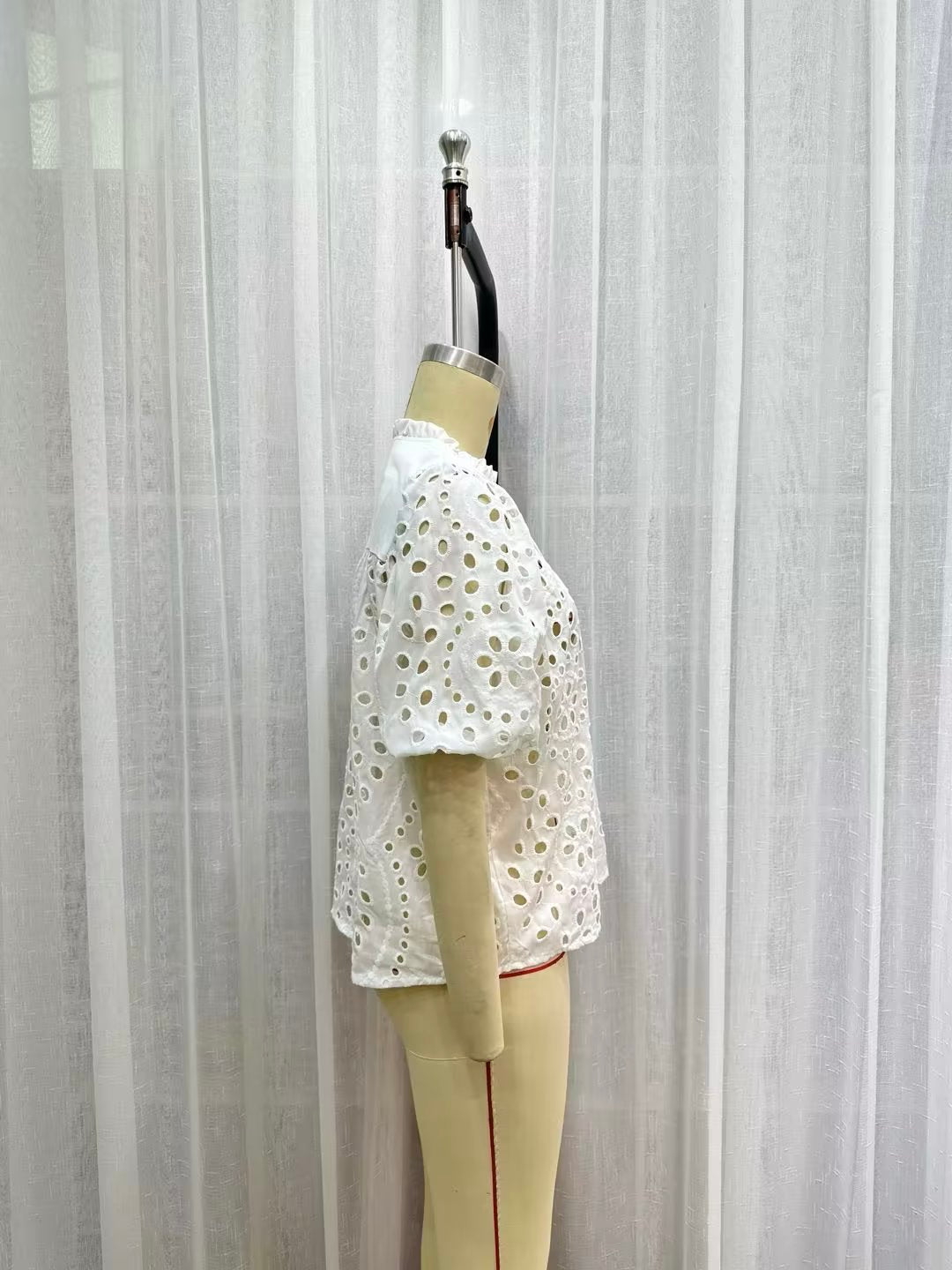 Summer Women Long Sleeve Hollow Out Cutout Embroidered White Shirt