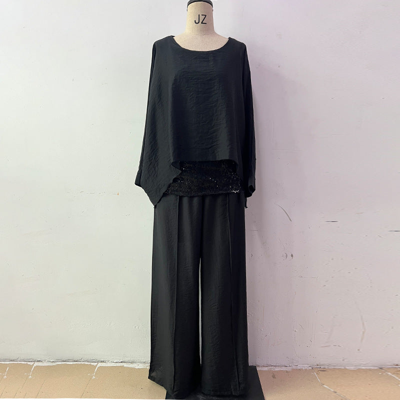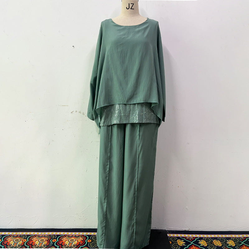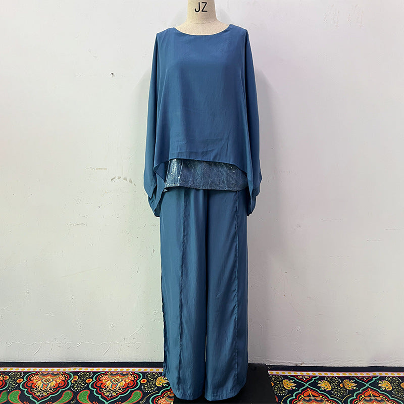 Summer Women Printed Ice Silk Breathable V neck Loose Wide Leg Pants Casual Set