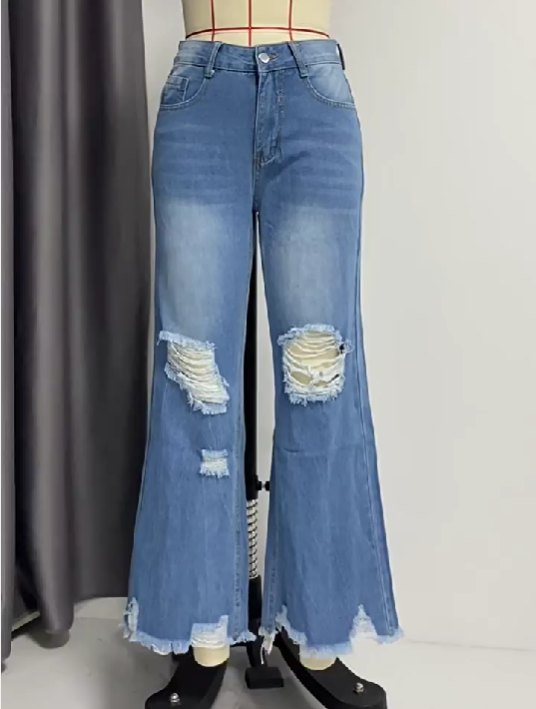 Tassel Water Washed Hole Women's Jeans Long Casual Mid High Waist Wide Leg Pants Trousers