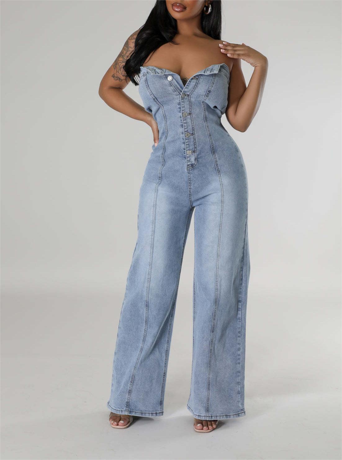 Tube Top Women Slim Fit Wide Leg Denim Jumpsuit