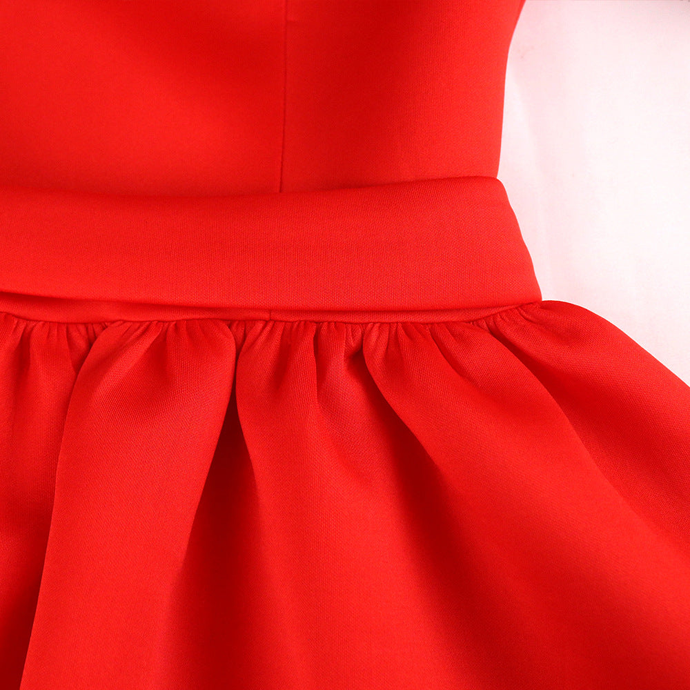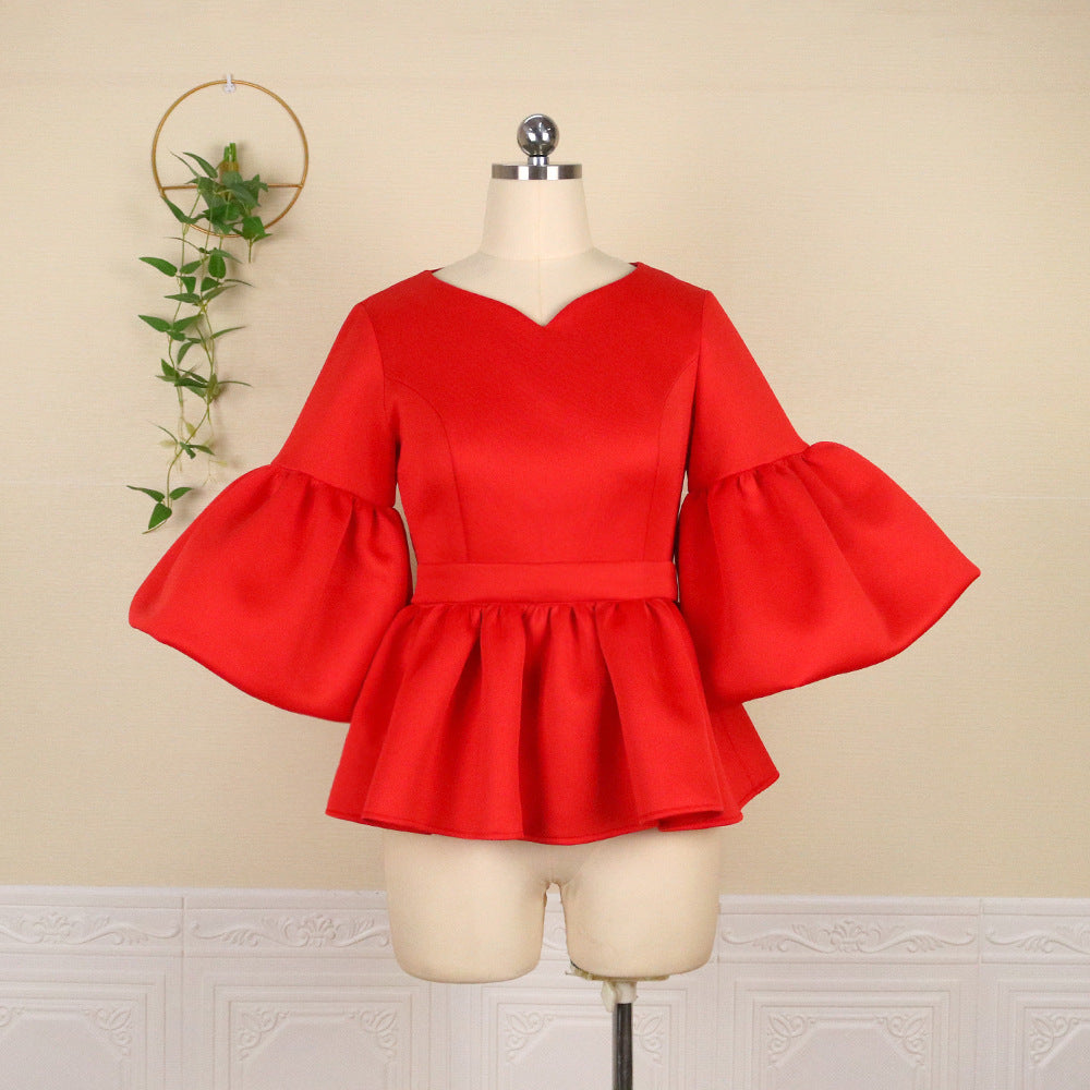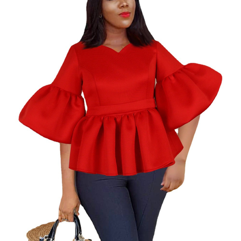 V-neck Flared Sleeves Flounced All-Match Solid Color Stretch plus Size Women