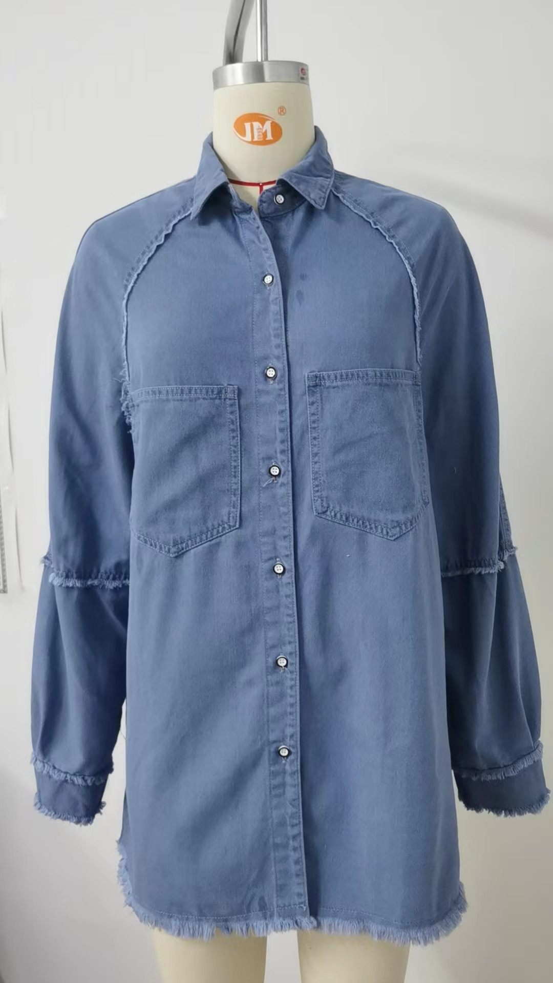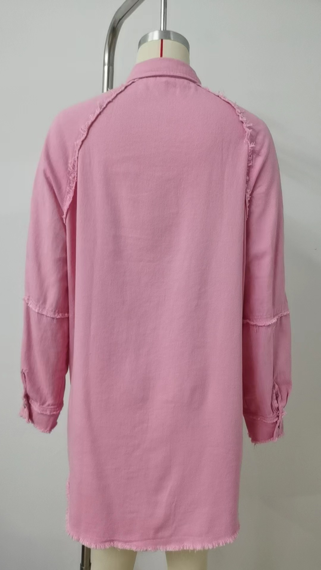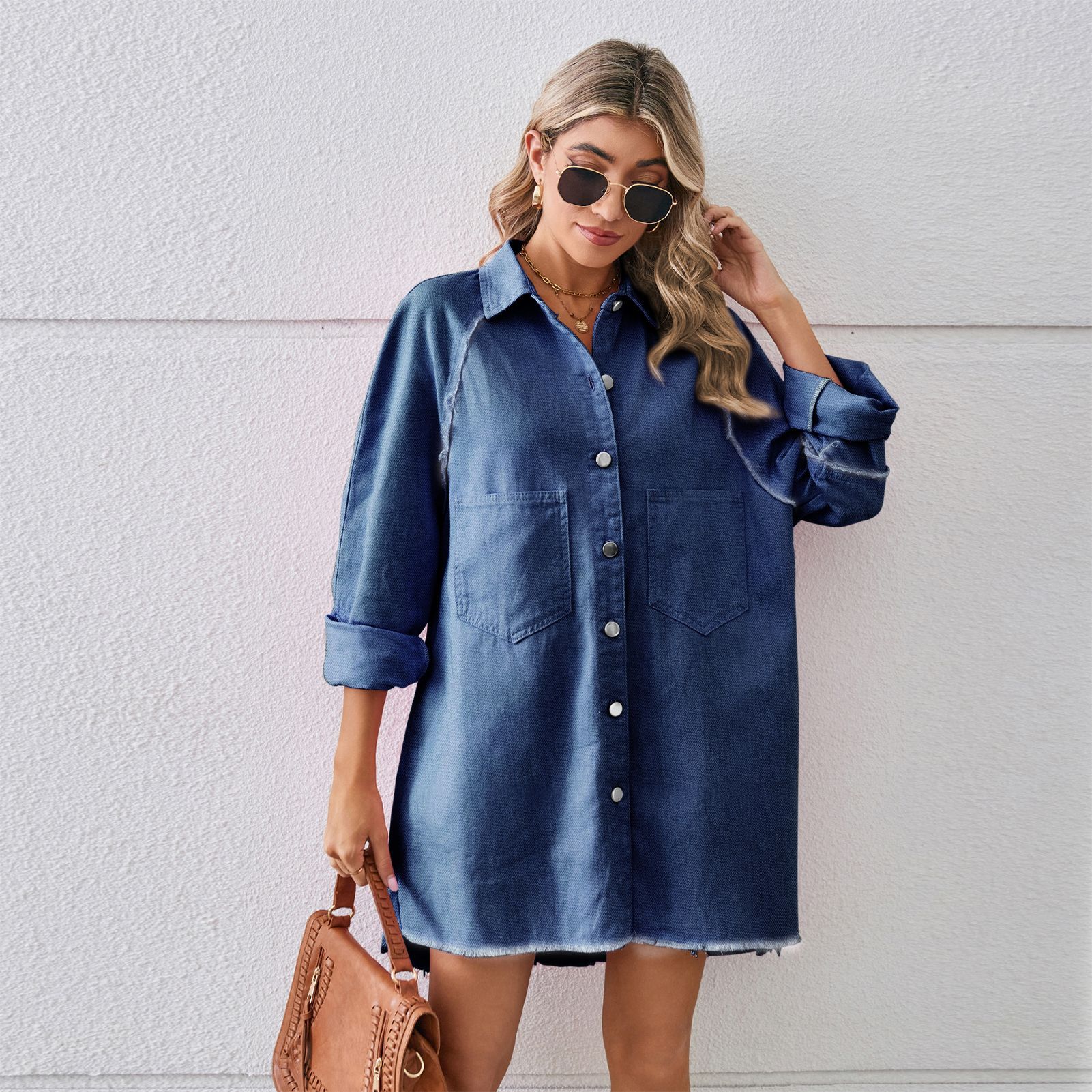 Wash Water Raw Edge Denim Dress Stitching Long Sleeve Cardigan for Women