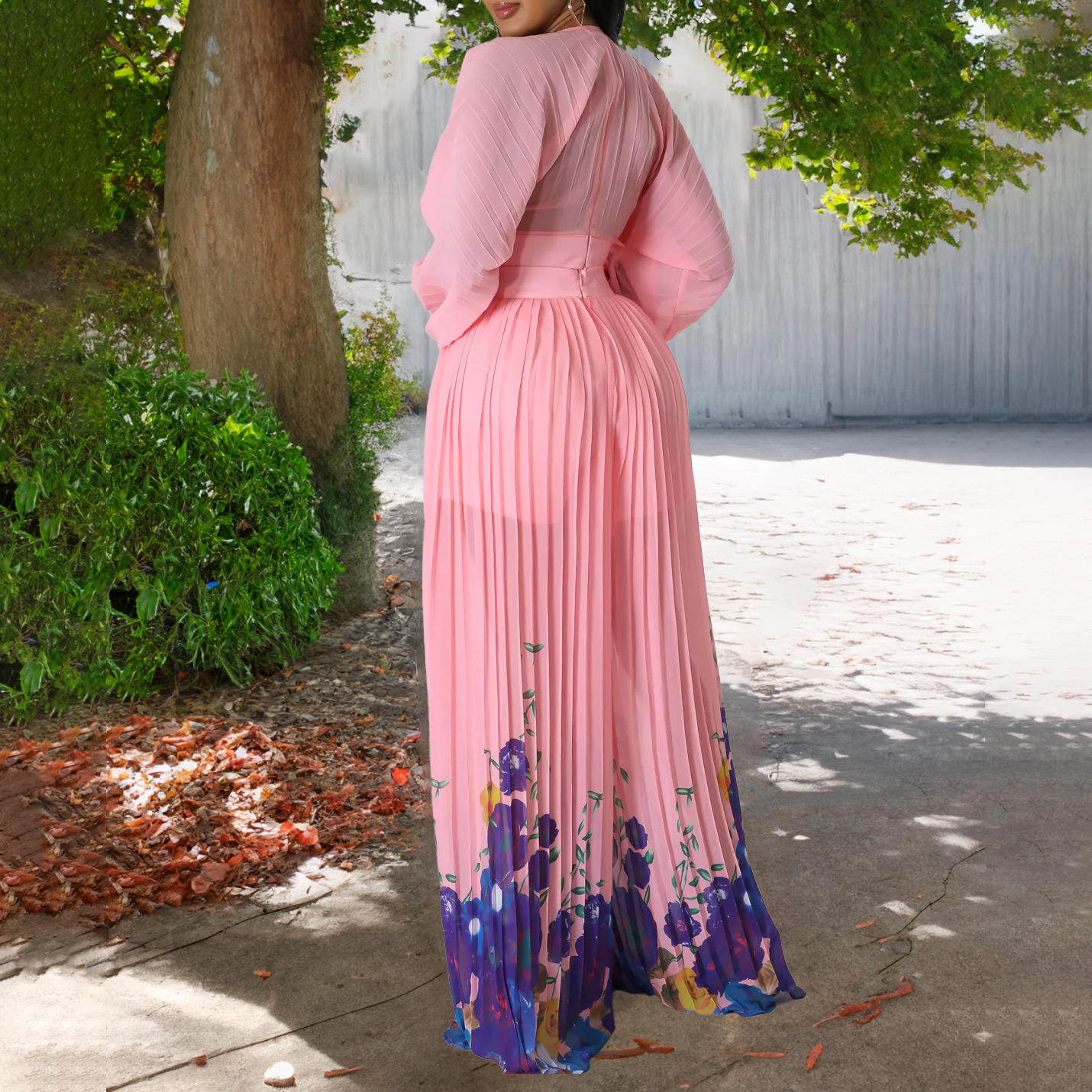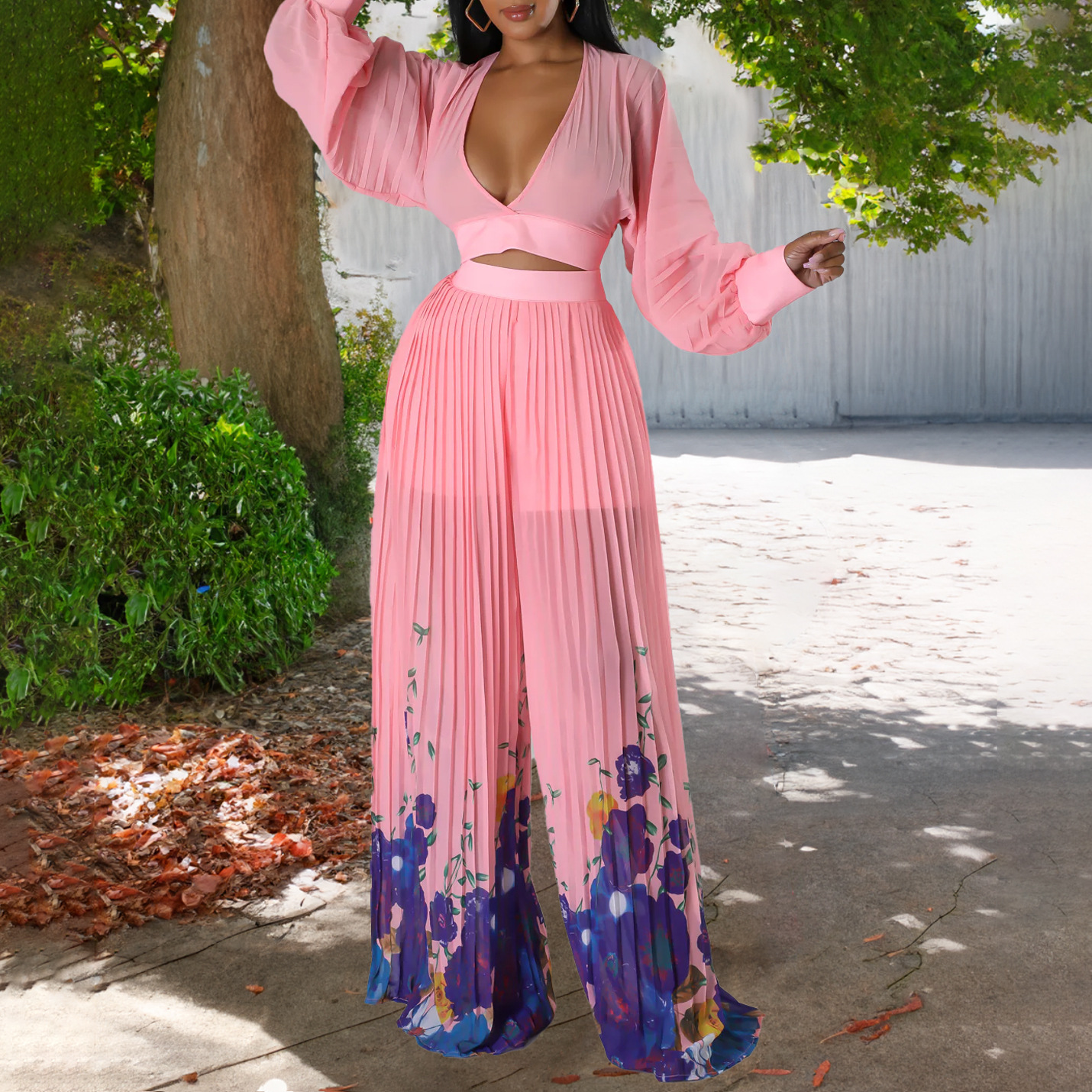 Women Clothing Autumn Elegant Chiffon V Neck Pleated Top Printed Wide Leg Pants Suit