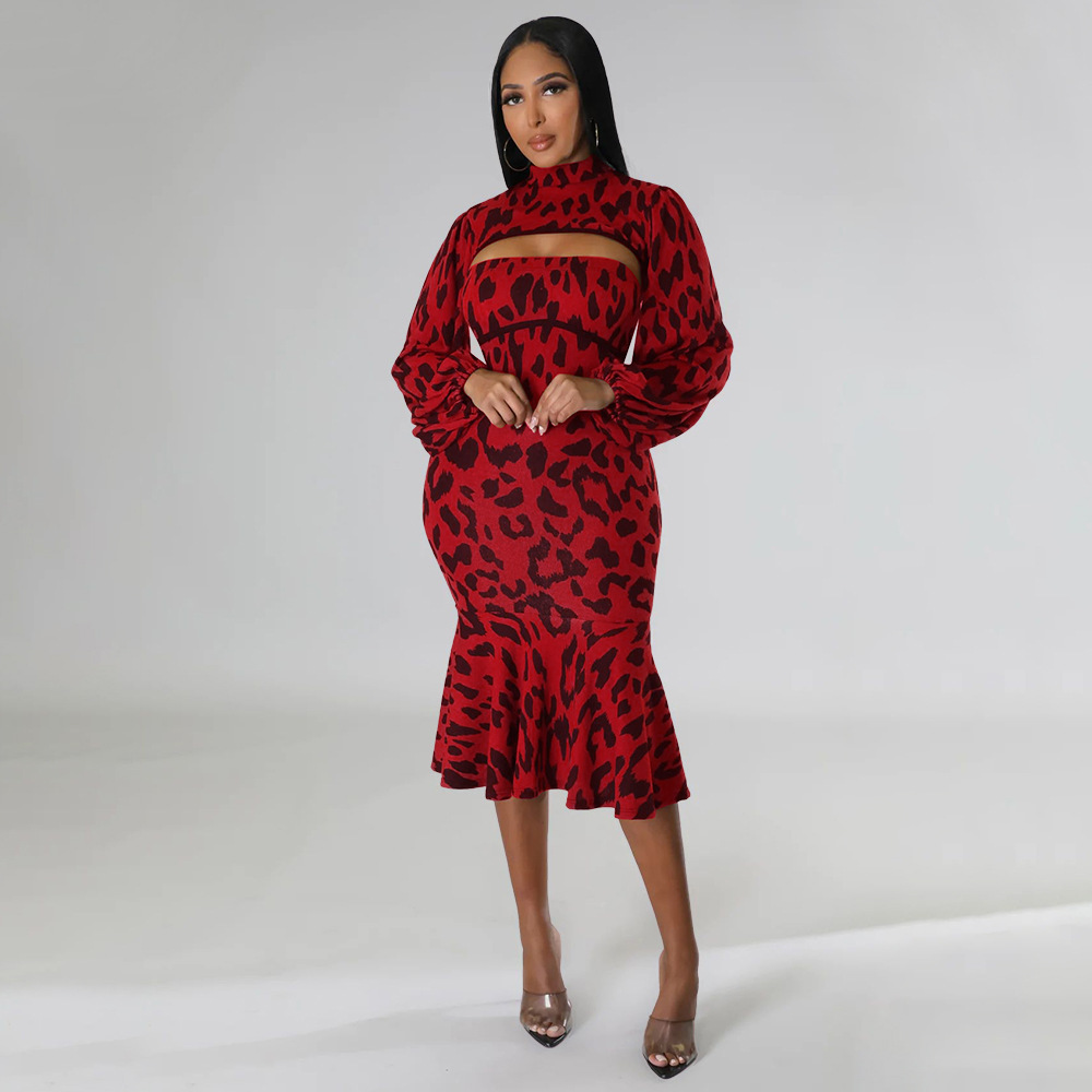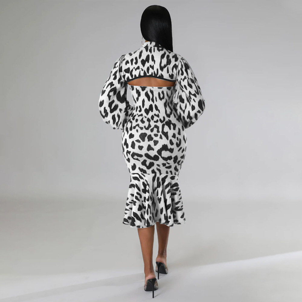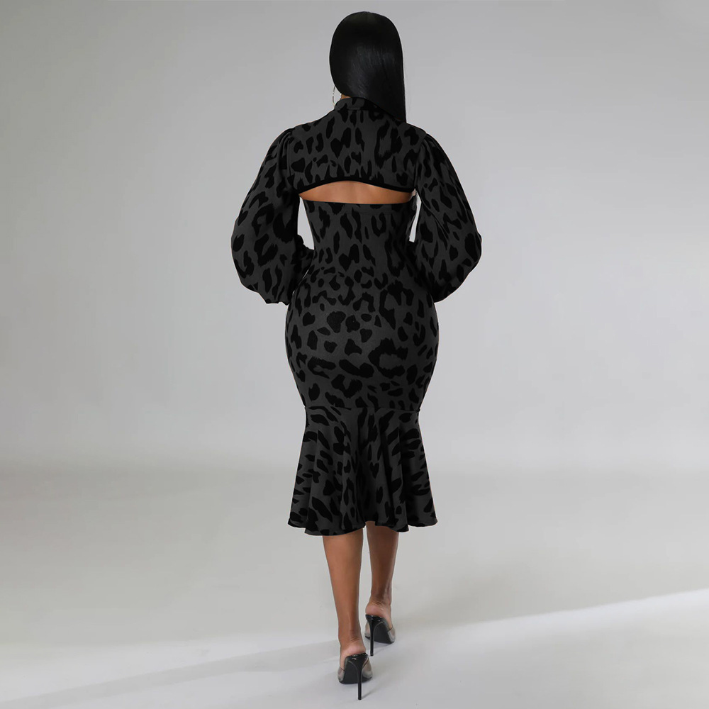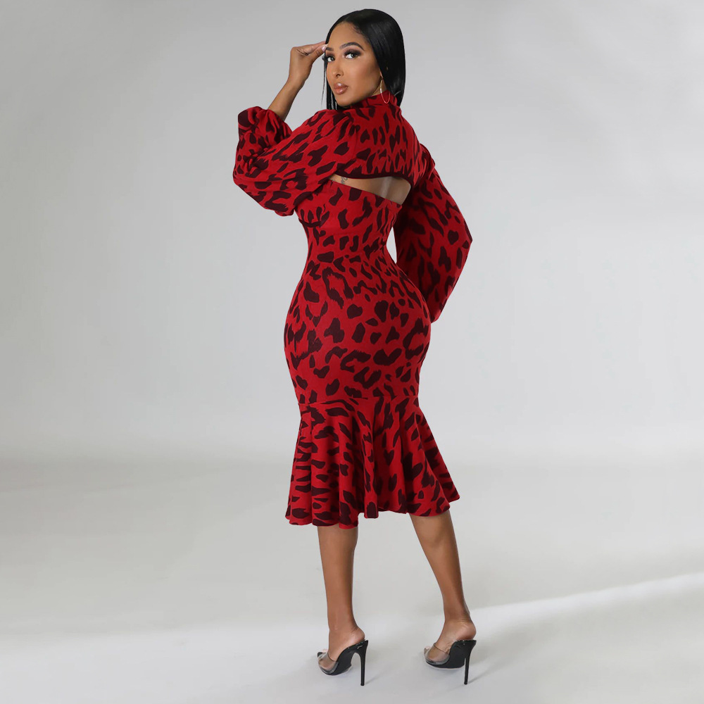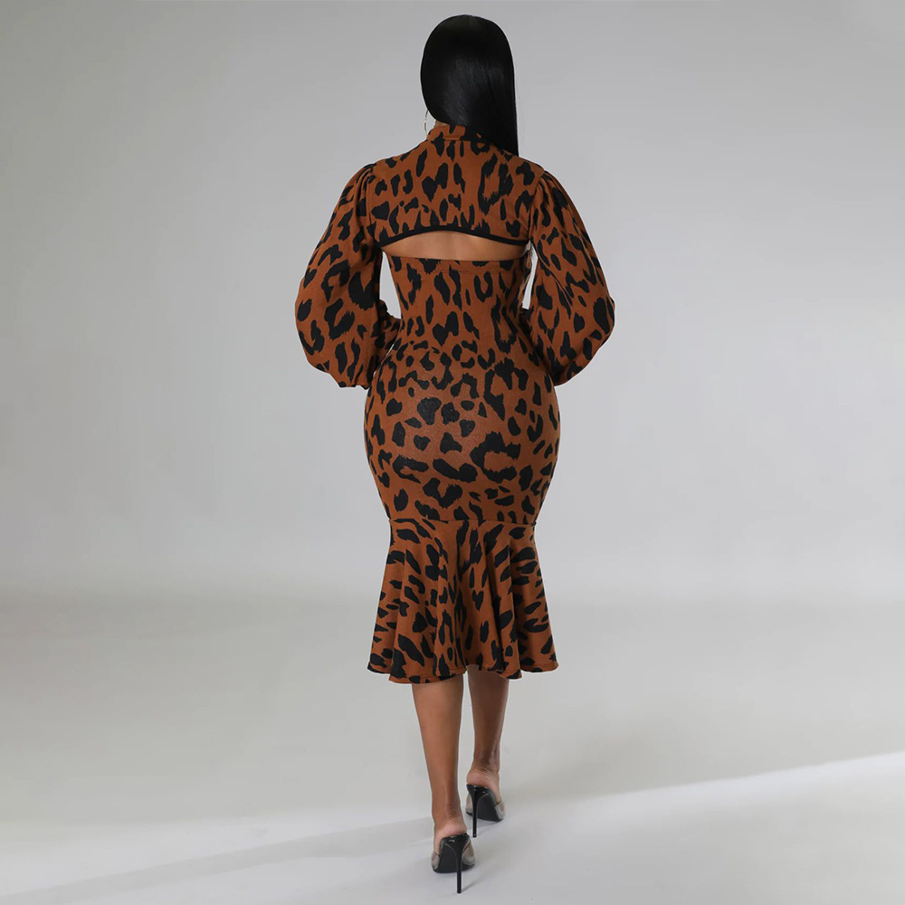 Women Clothing Autumn Lantern Sleeve Flounced Set Leopard Print Two Piece Set