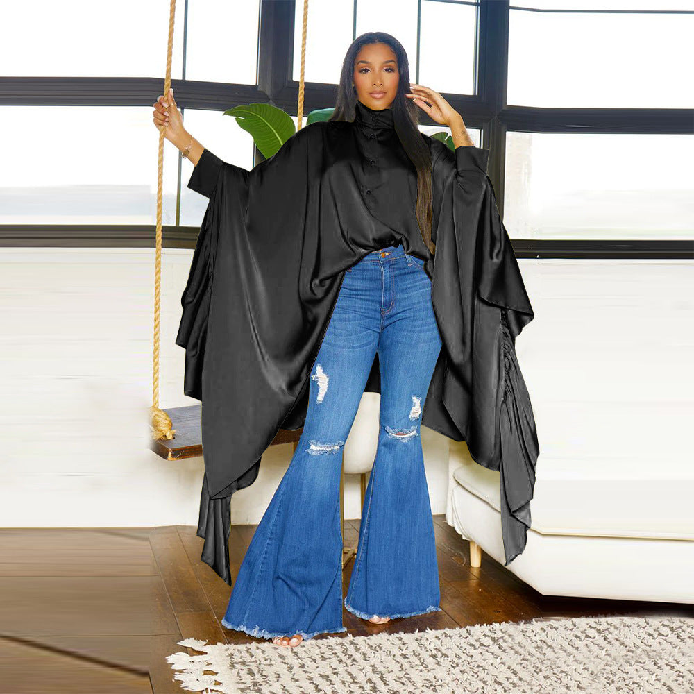 Women Clothing Autumn Pleated Long Solid Color Shawl Shirt