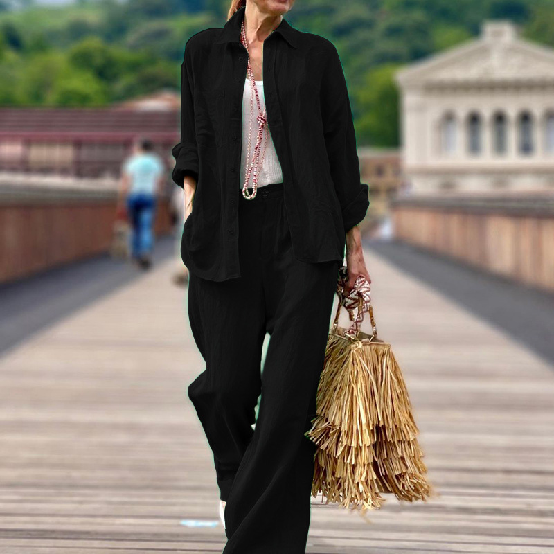 Women Clothing Autumn Solid Color Long Sleeve Shirt Trousers Set