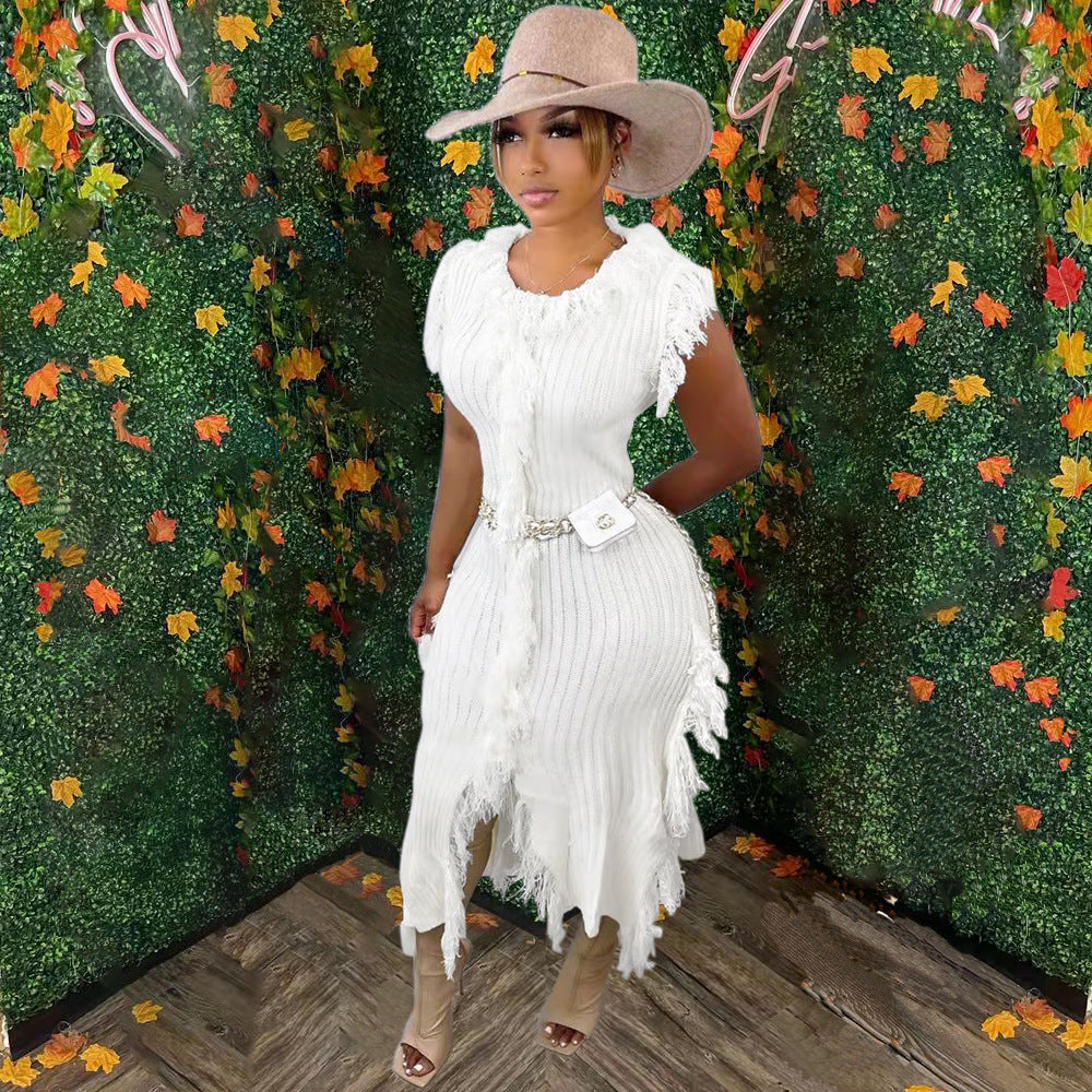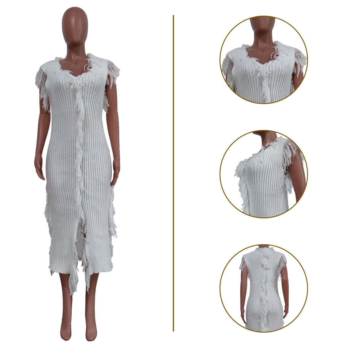Women Clothing Casual Solid Color Knitted Sleeveless Tassel Dress