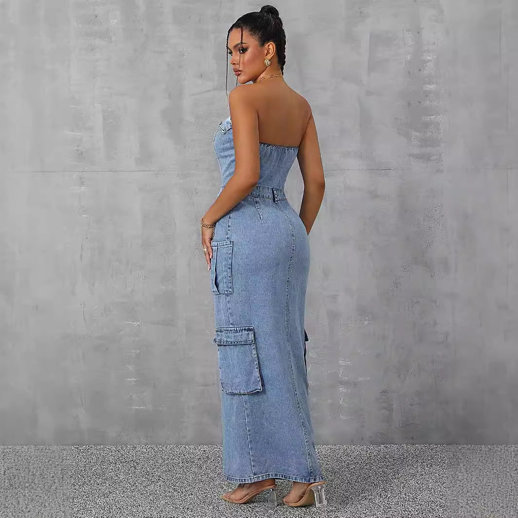 Women Clothing Casual Tube Top Tooling Large Pocket Denim Dress