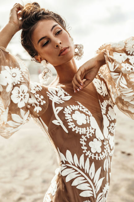 Women Clothing Deep V Plunge Mesh Embroidered Puff Sleeve Backless Dress