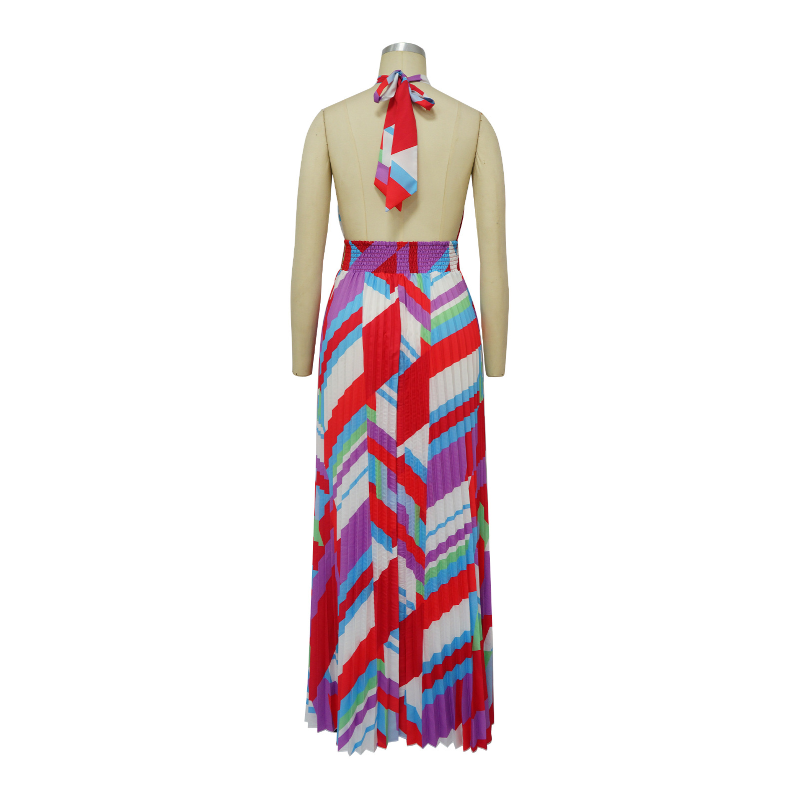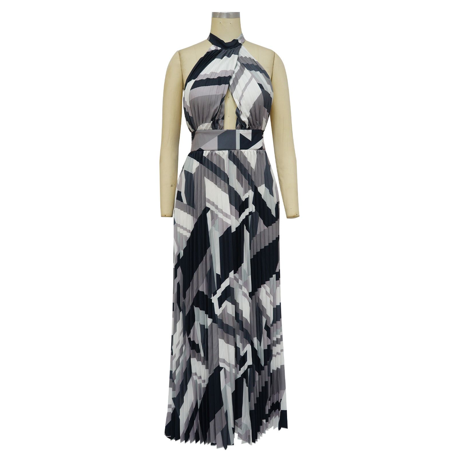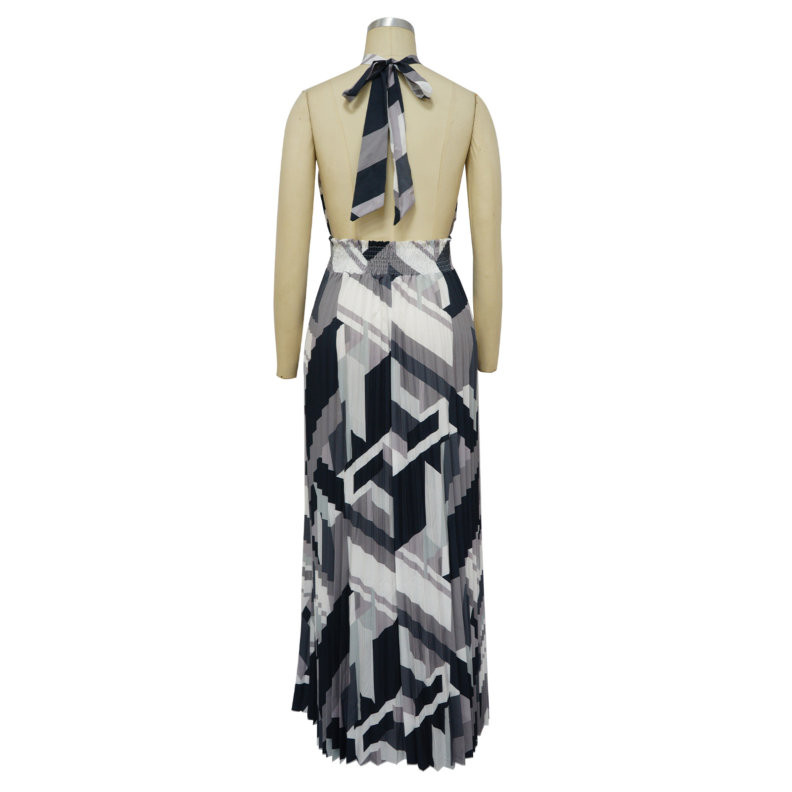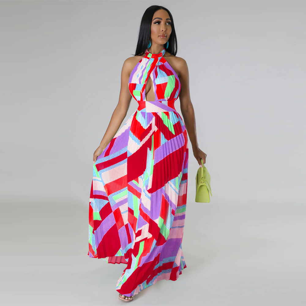 Women Clothing Halter Backless Pleated Large Swing Dress Printed Sleeveless Dress