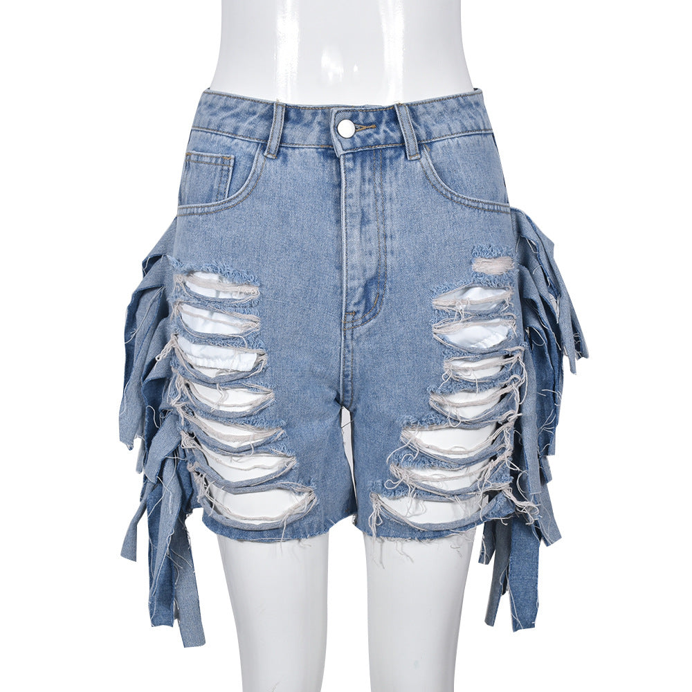 Women Clothing High Waist Ripped Washed Personalized Hole Tassel Shorts