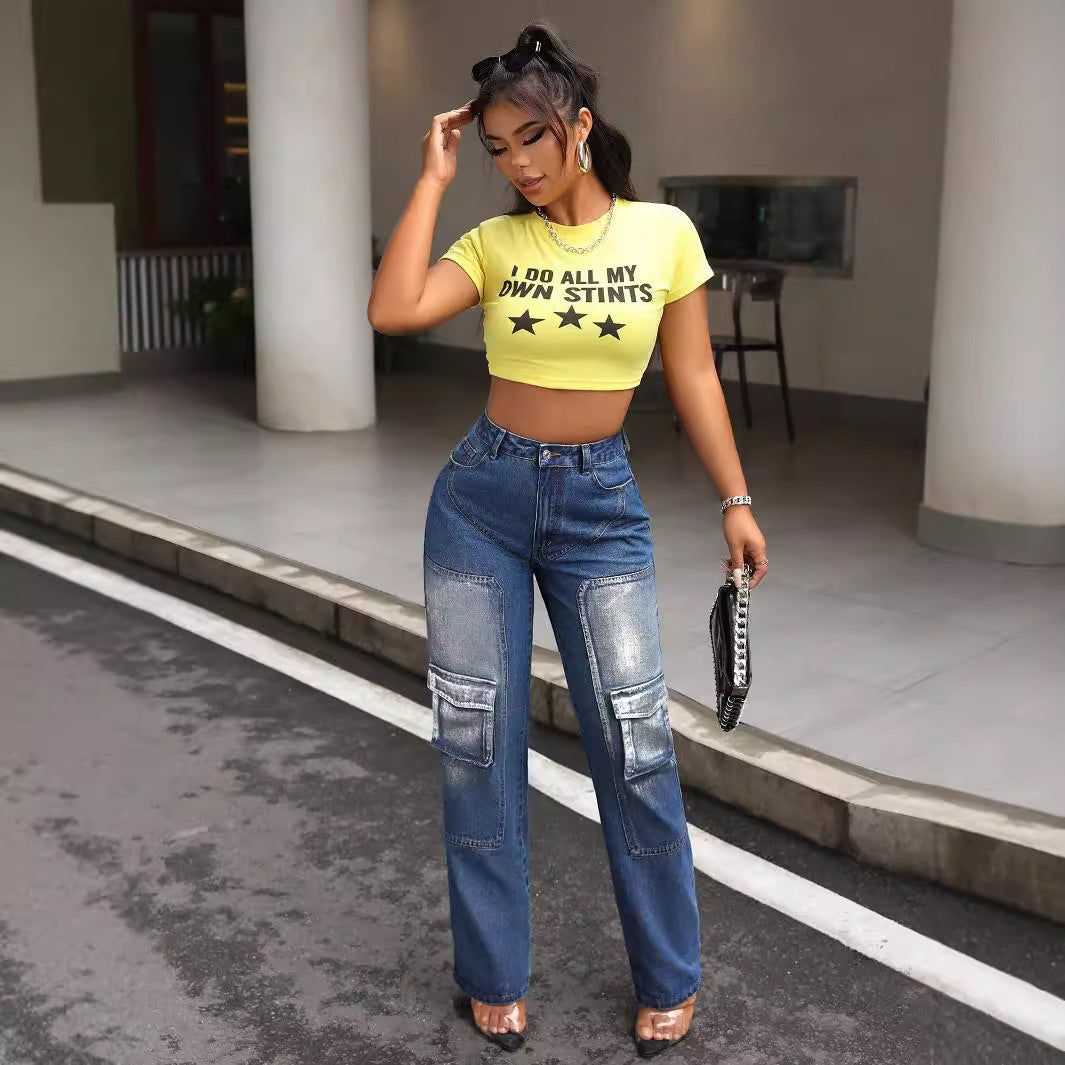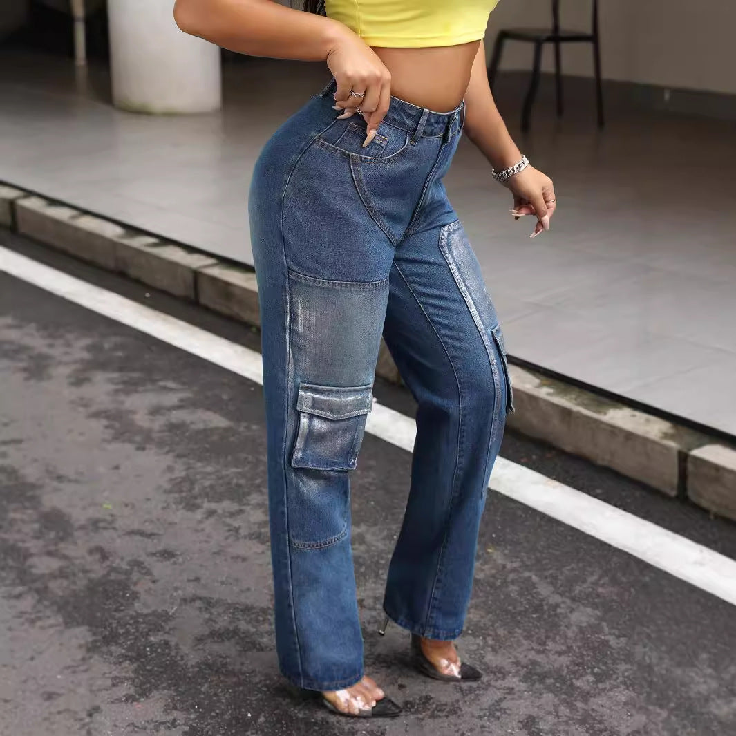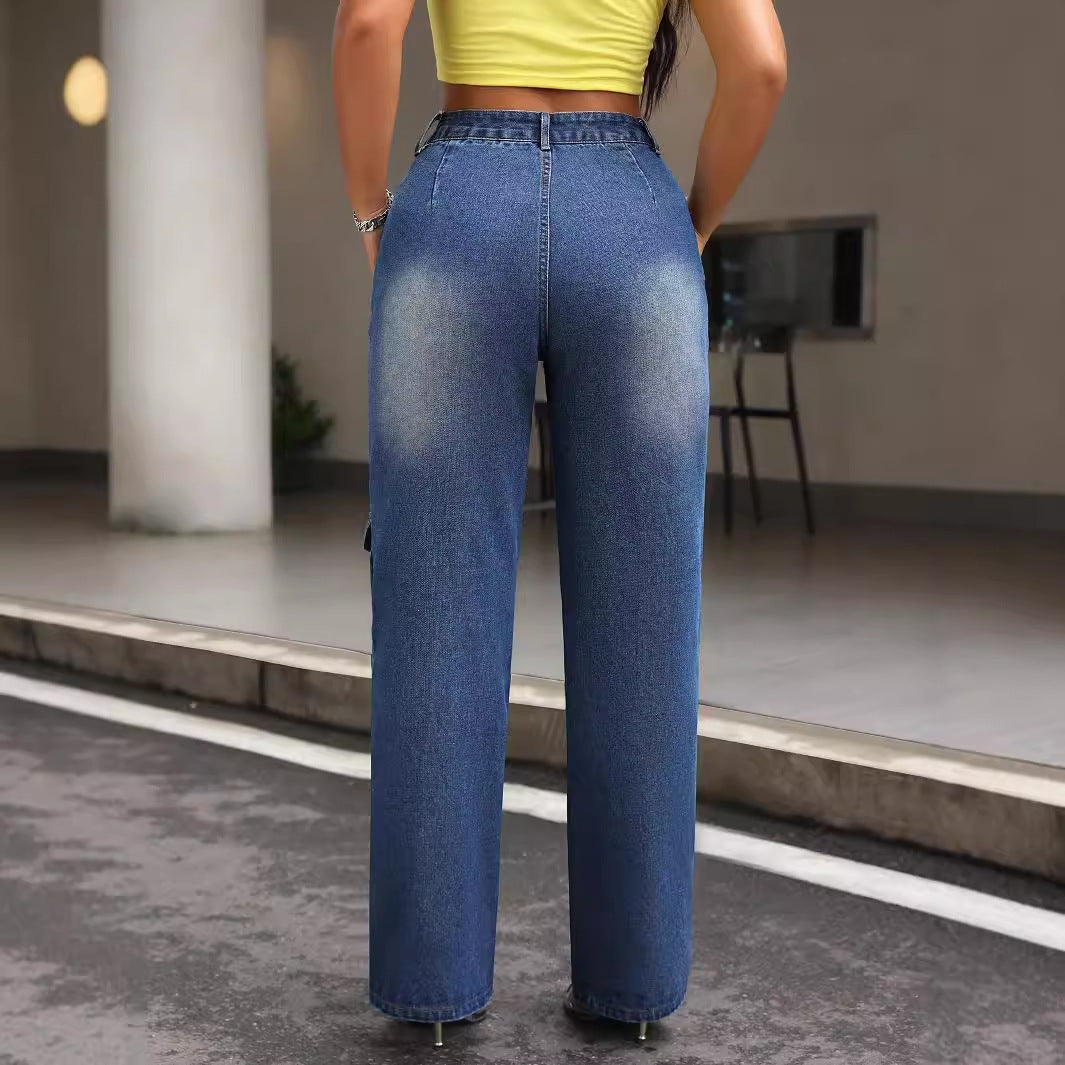 Women Clothing High Waist Work Clothes Pocket Slimming Jeans Trousers