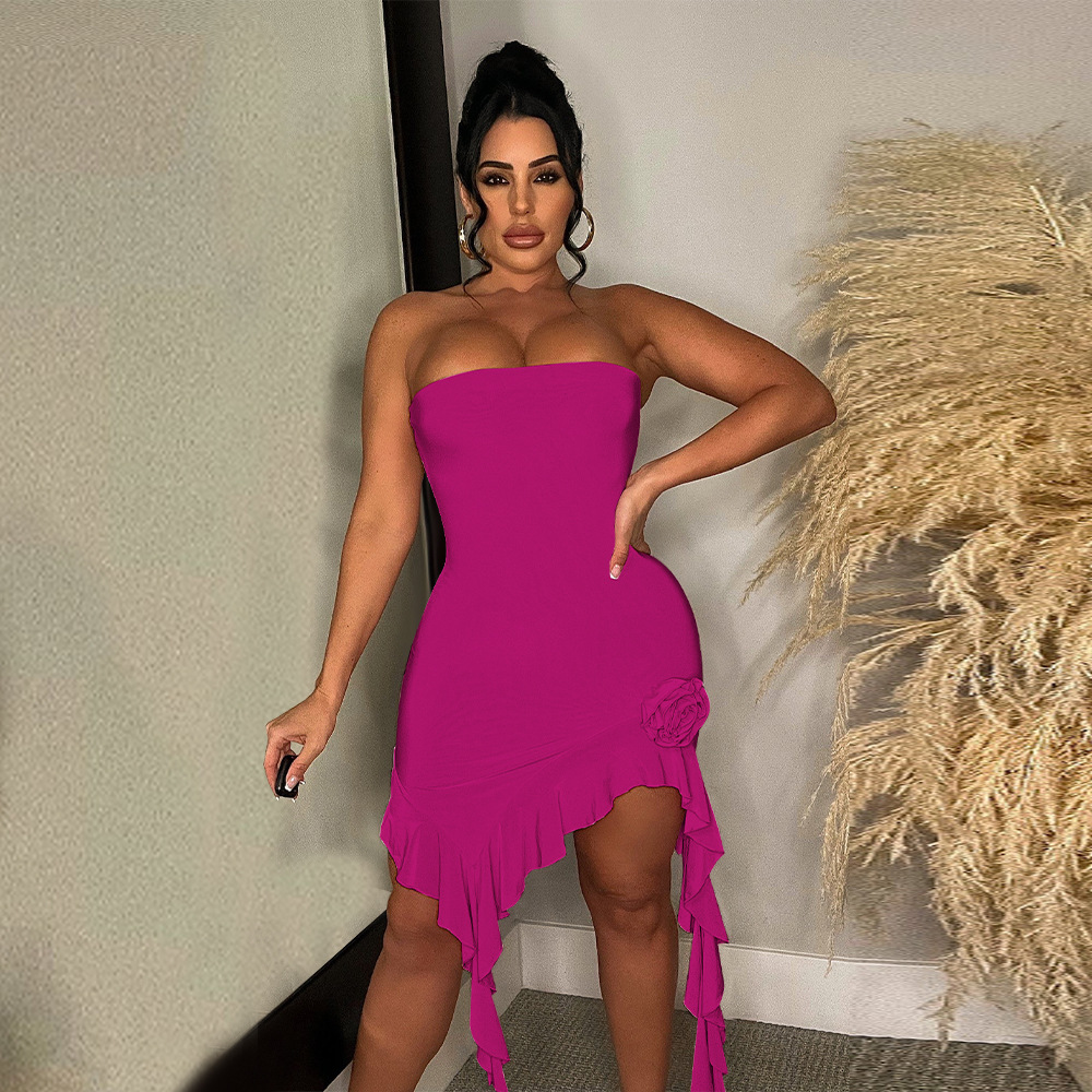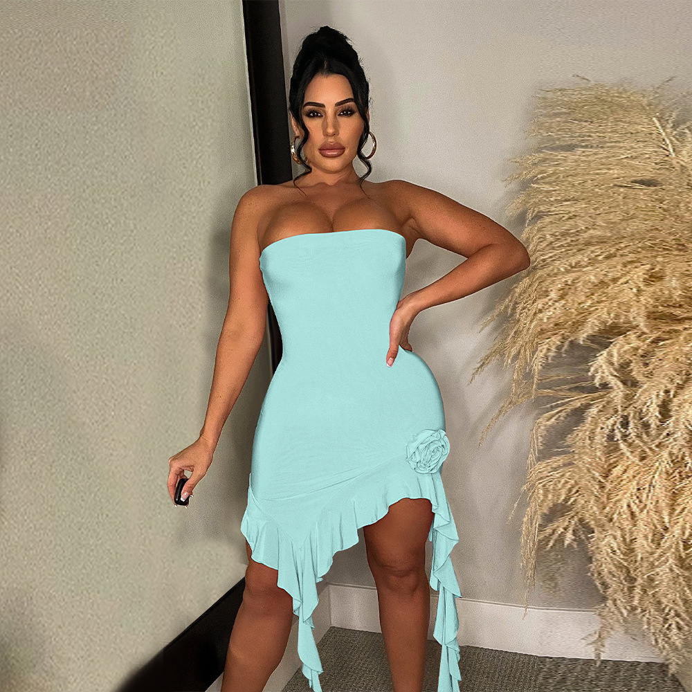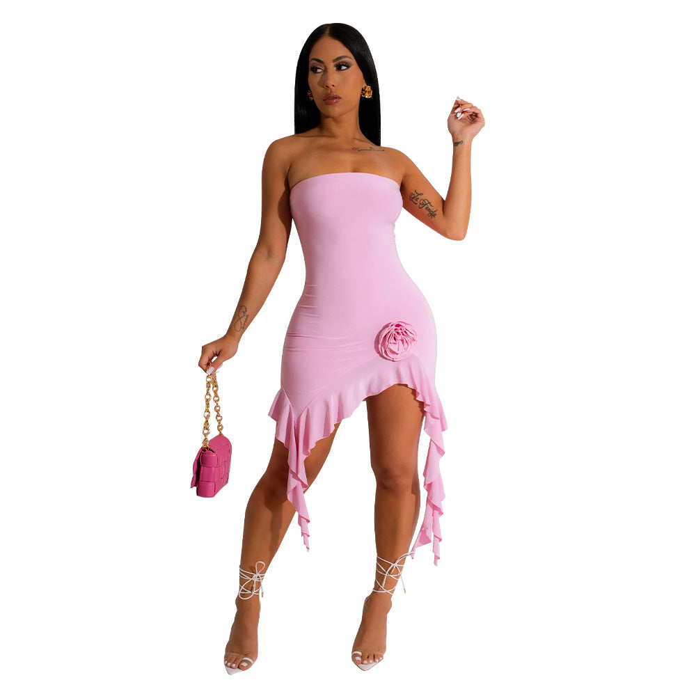 Women Clothing Independent Stand Floral Ruffled Solid Color Sexy Tube Top Irregular Asymmetric Dress