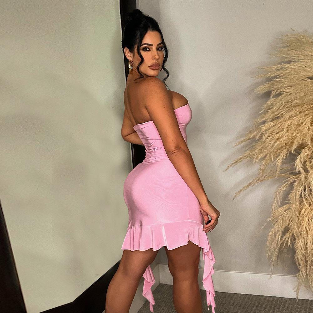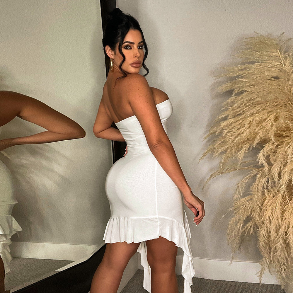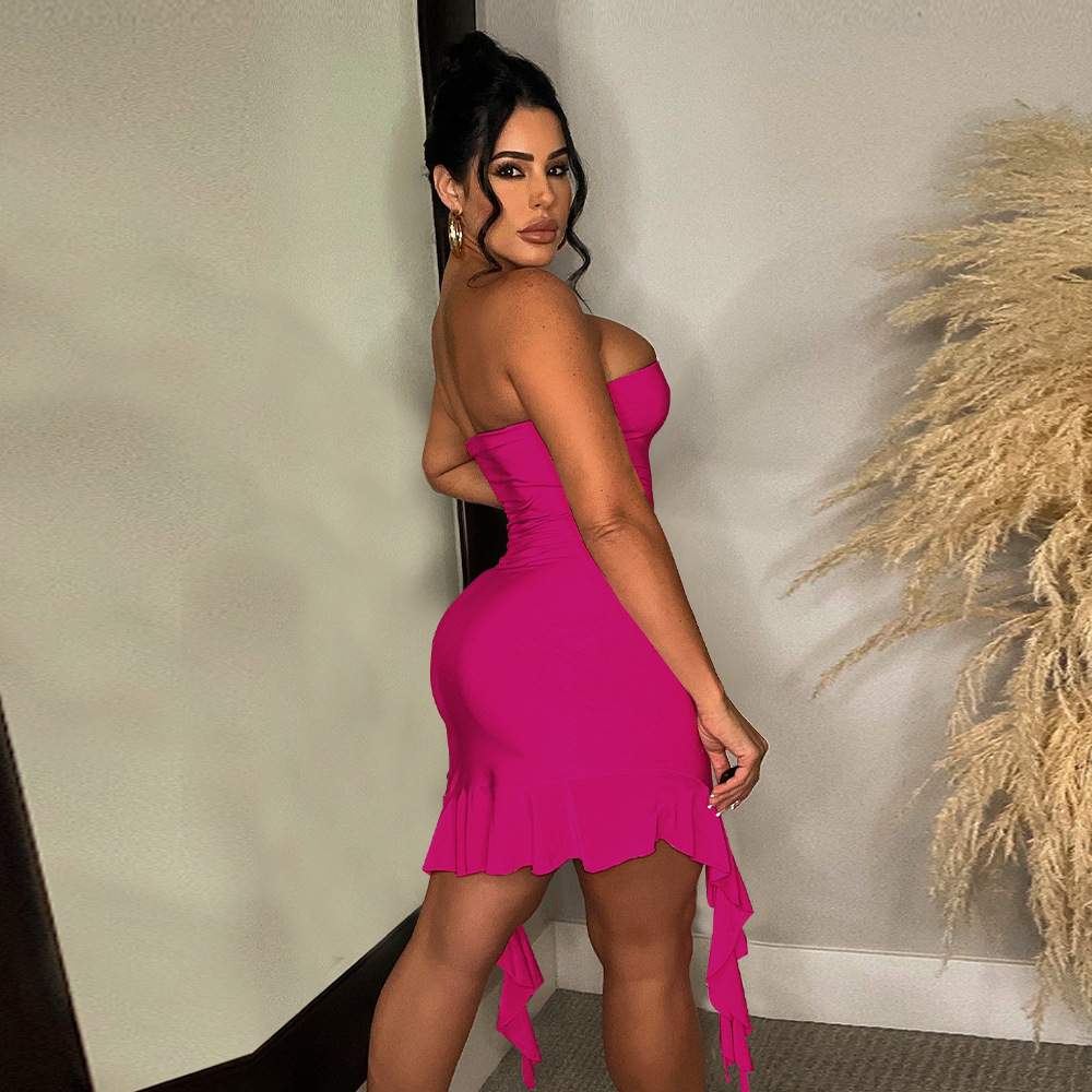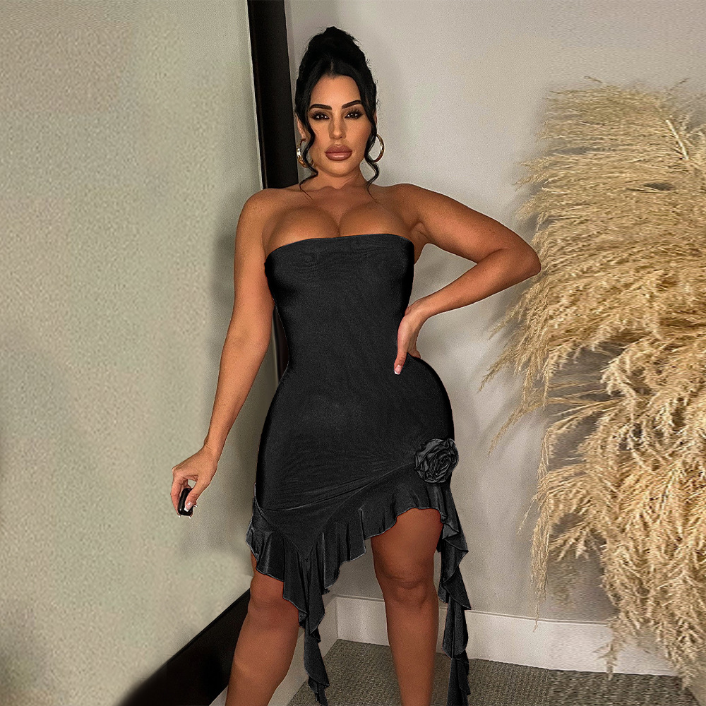 Women Clothing Independent Stand Floral Ruffled Solid Color Sexy Tube Top Irregular Asymmetric Dress