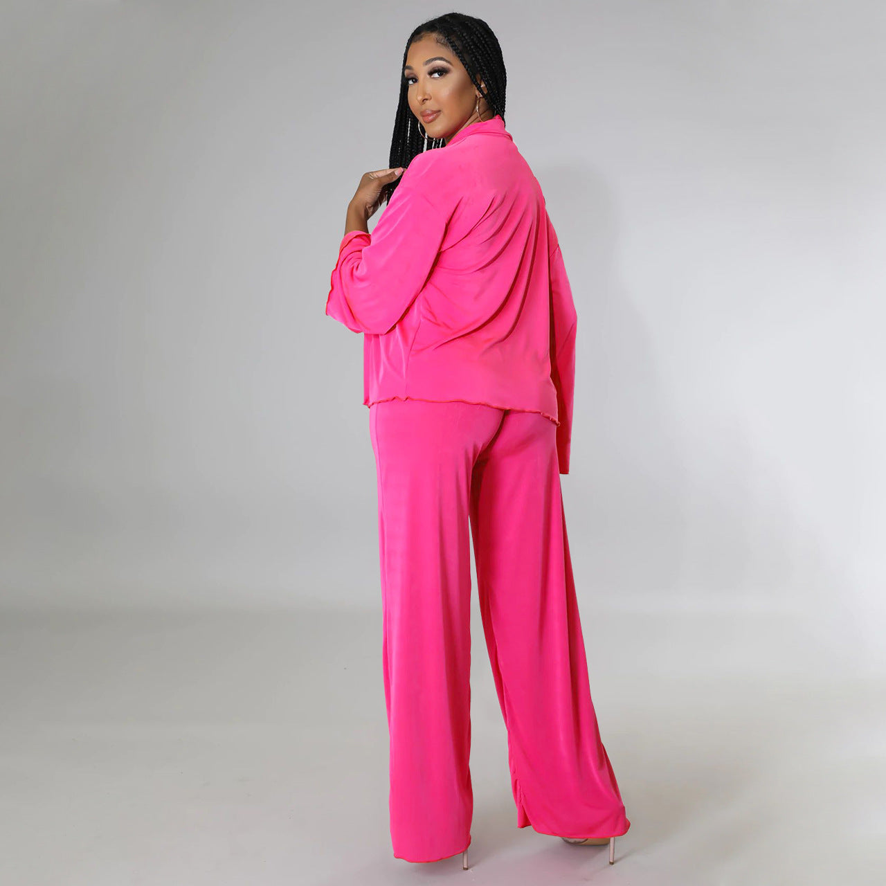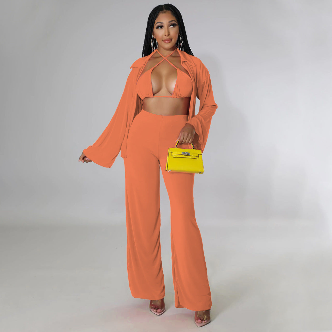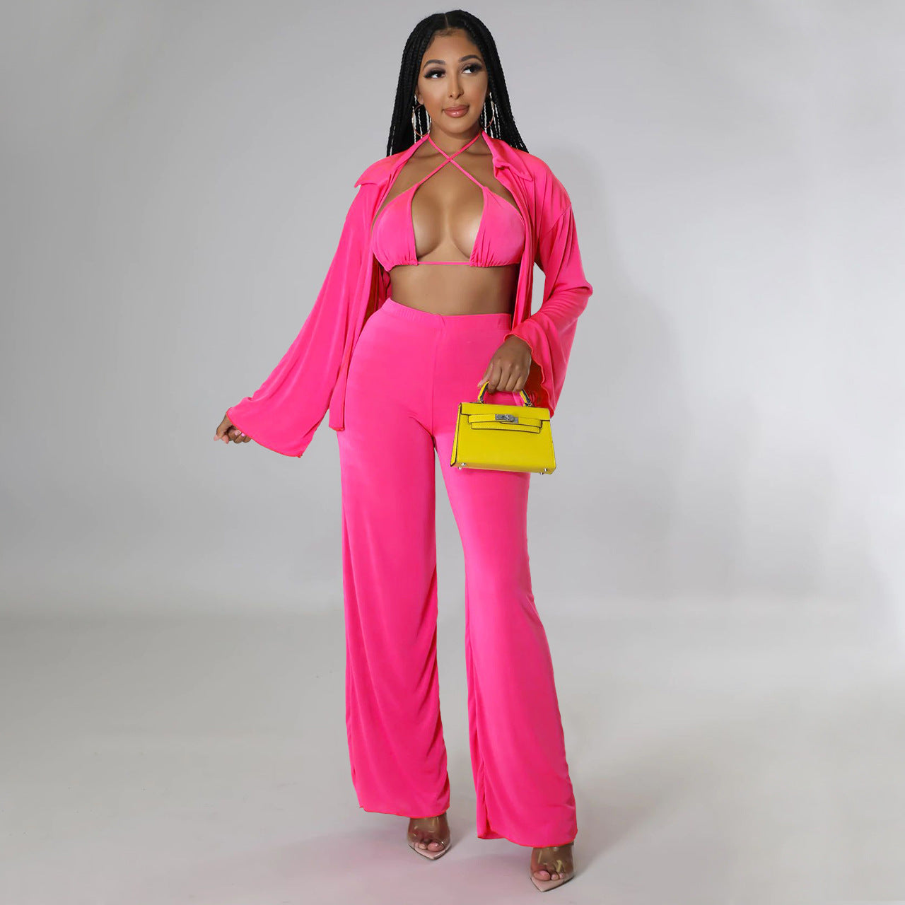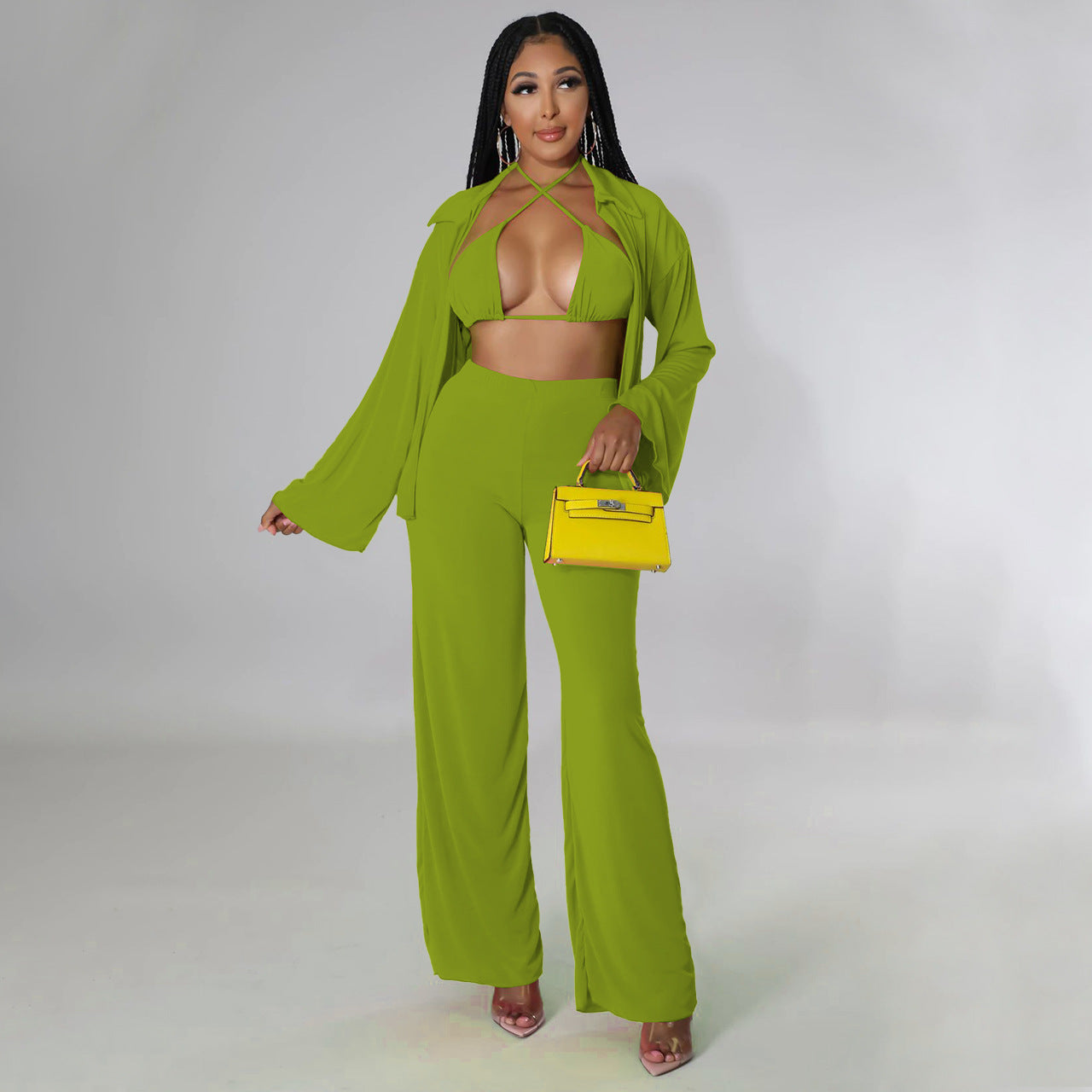 Women Clothing Long-Sleeved Bikini Wide-Leg Pants Solid Color Casual Set