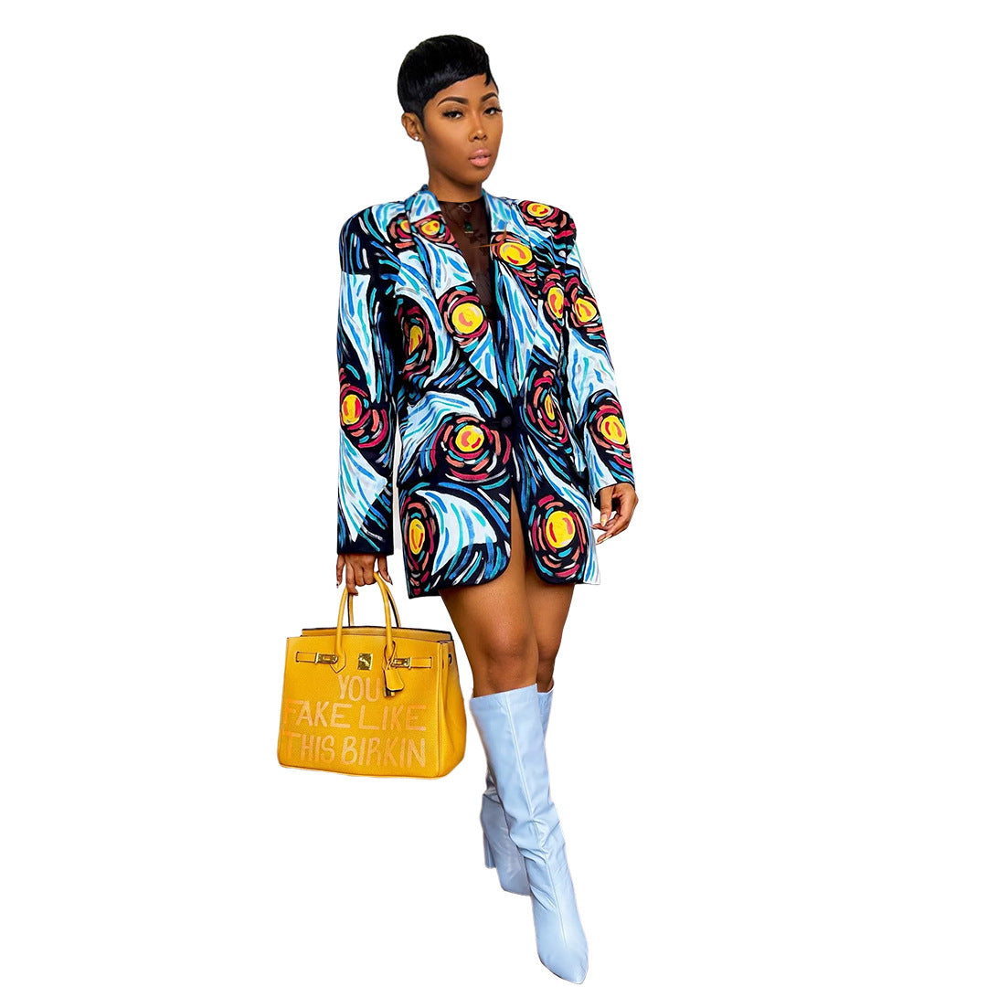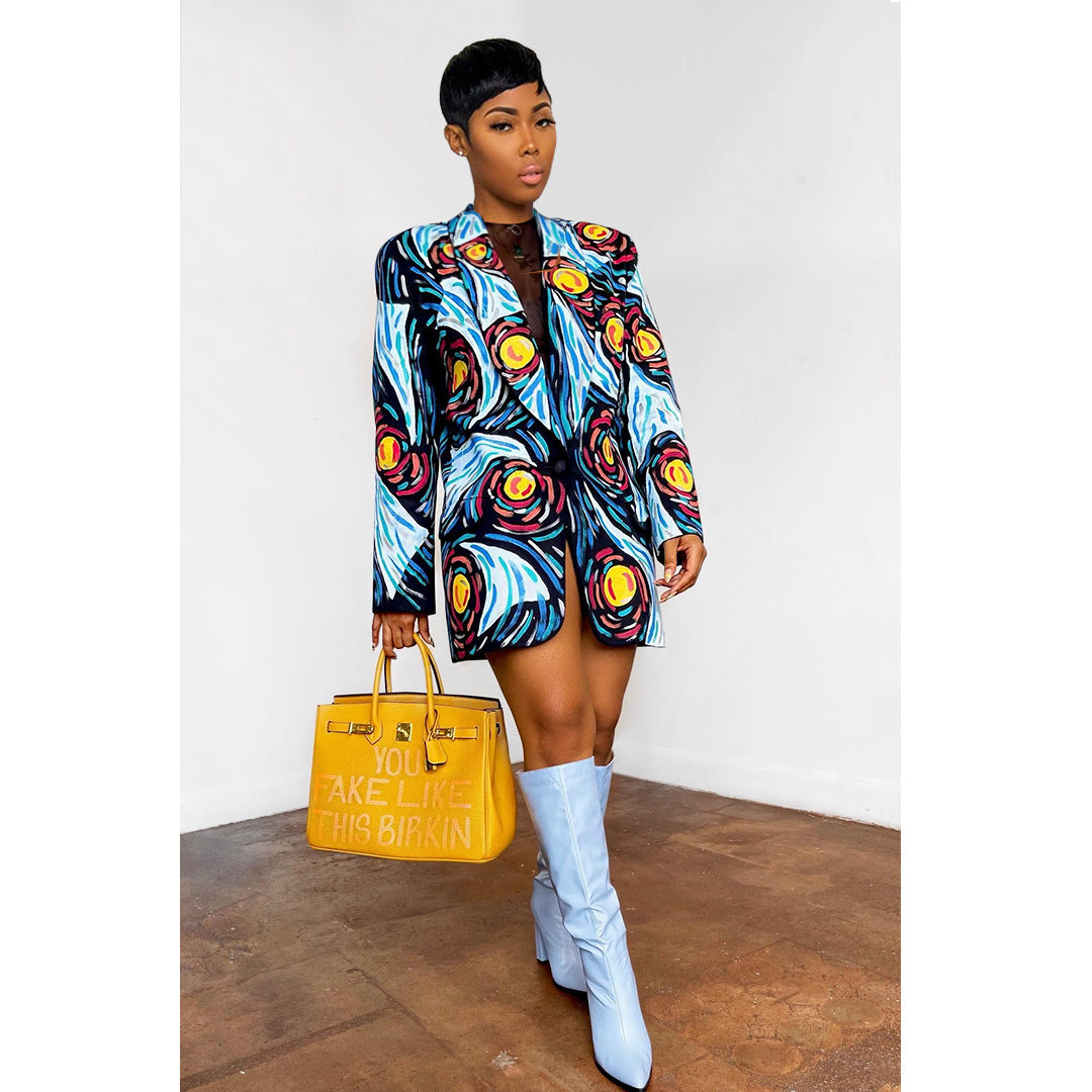 Women Clothing Nightclub Fashion Starry Sky Printed Woolen Single Button Blazer