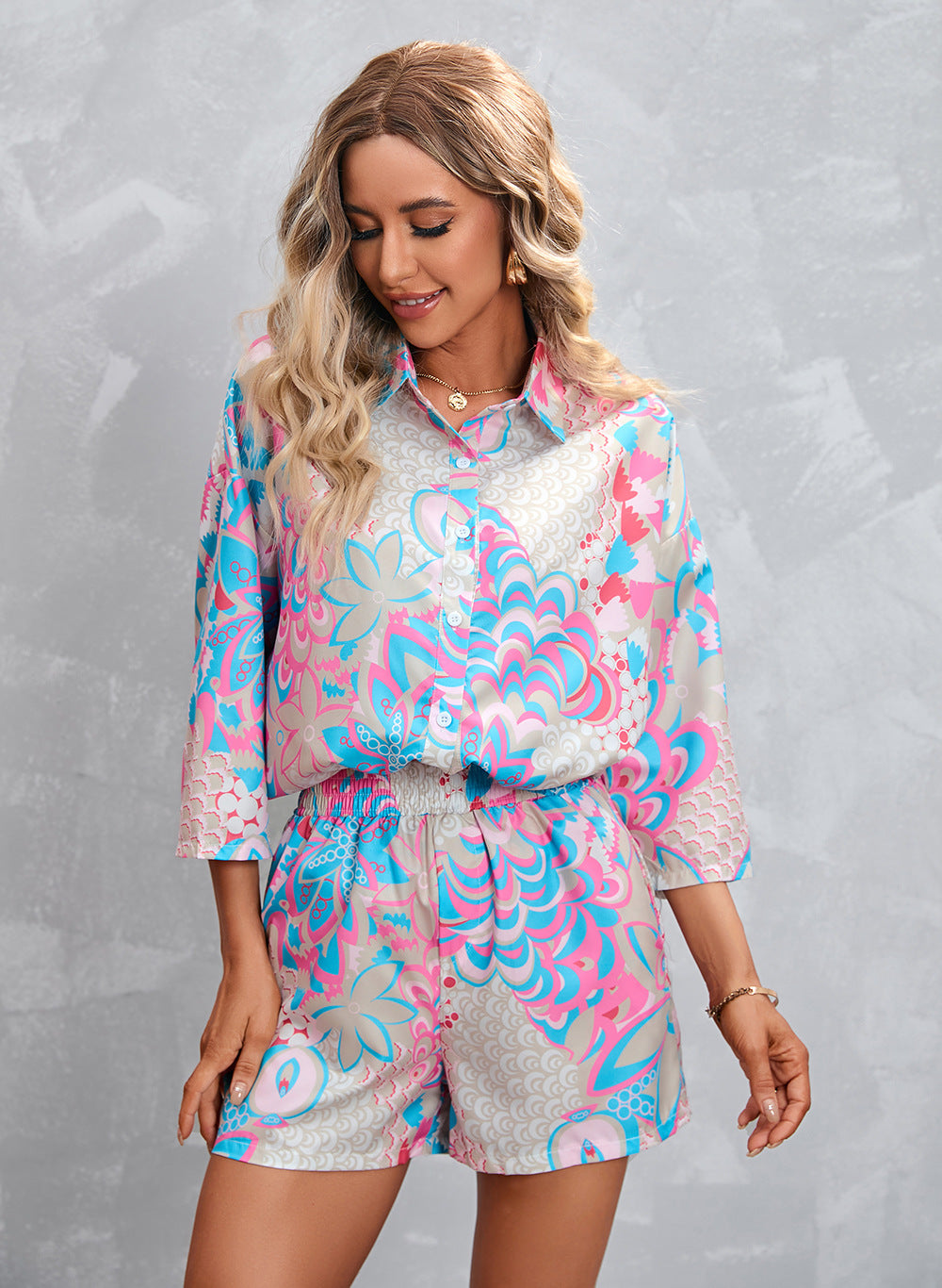 Women Clothing Printed 3/4 Sleeves Shorts Casual Suit
