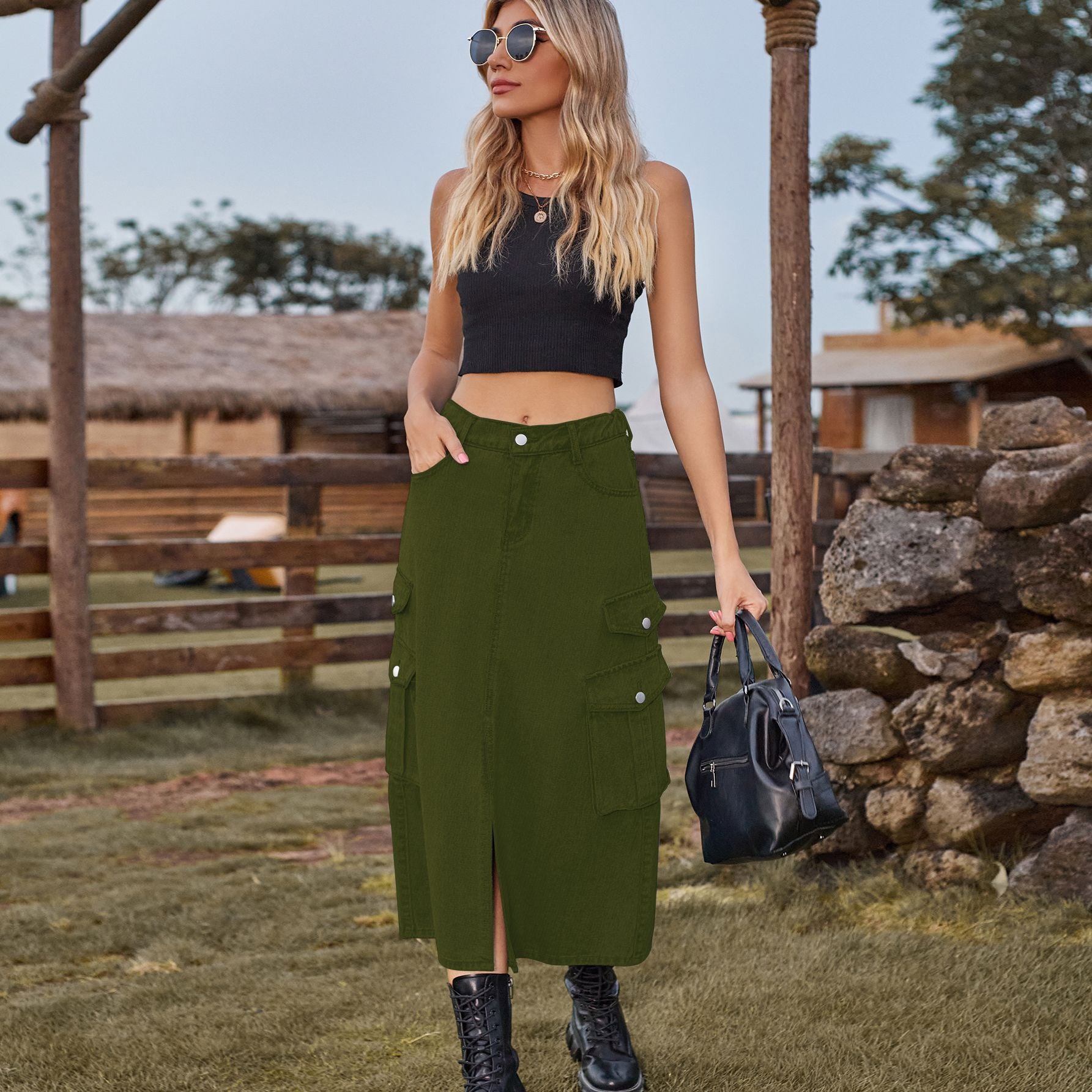 Women Clothing Sexy Elastic Waist Denim Cargo Pants Casual Midi Dress Skirt