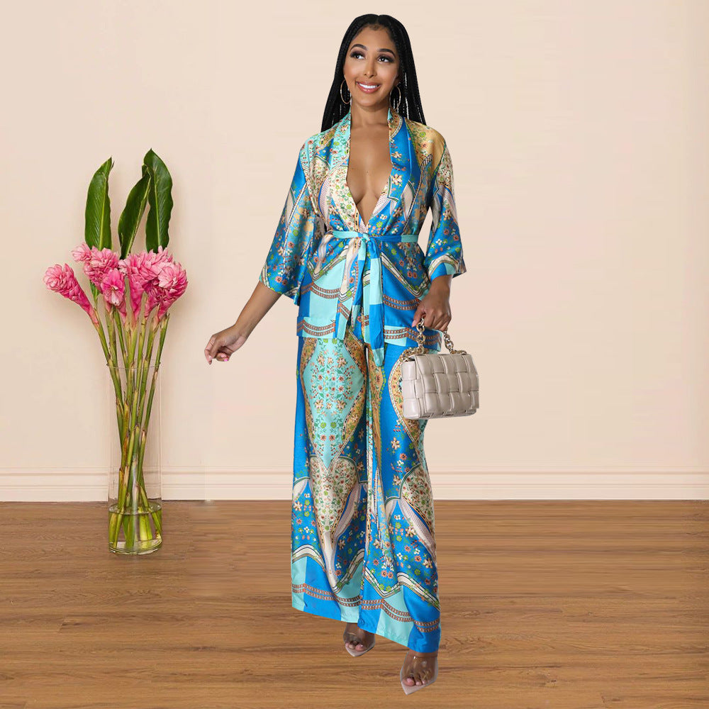 Women Clothing Silk-like Printed Wide-Leg Pants Two-Piece Set Multi-Color Optional