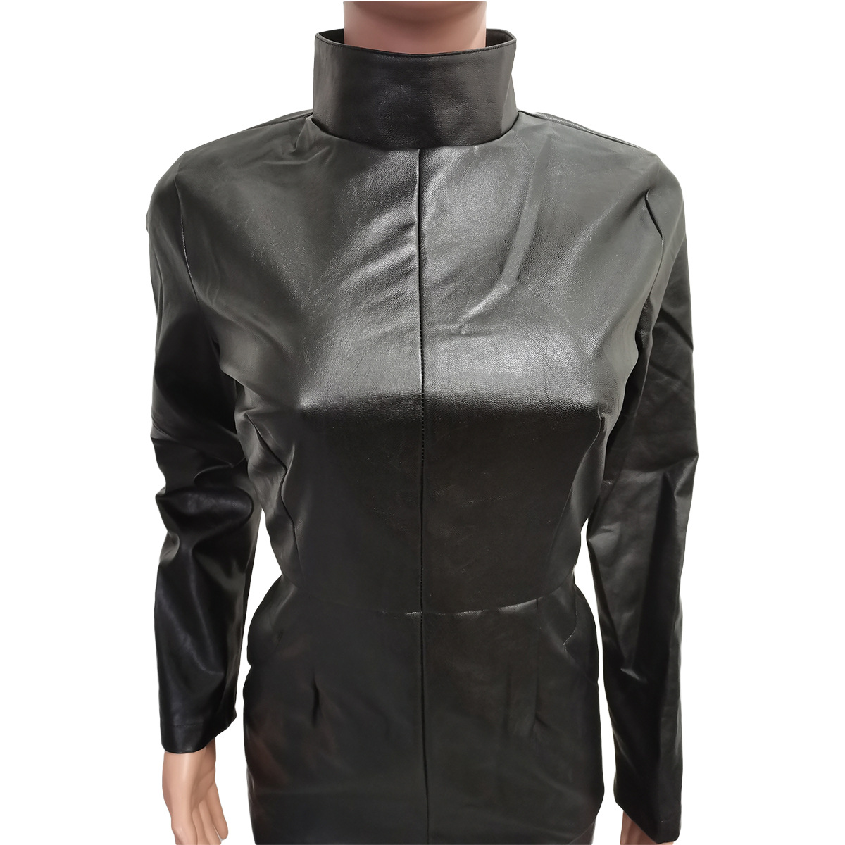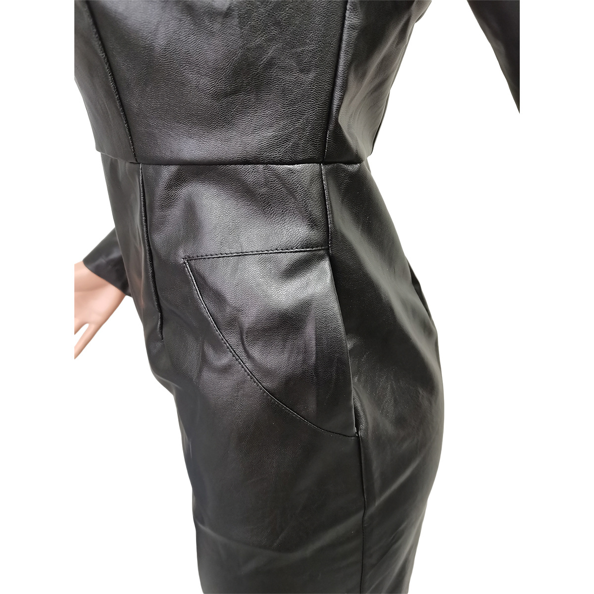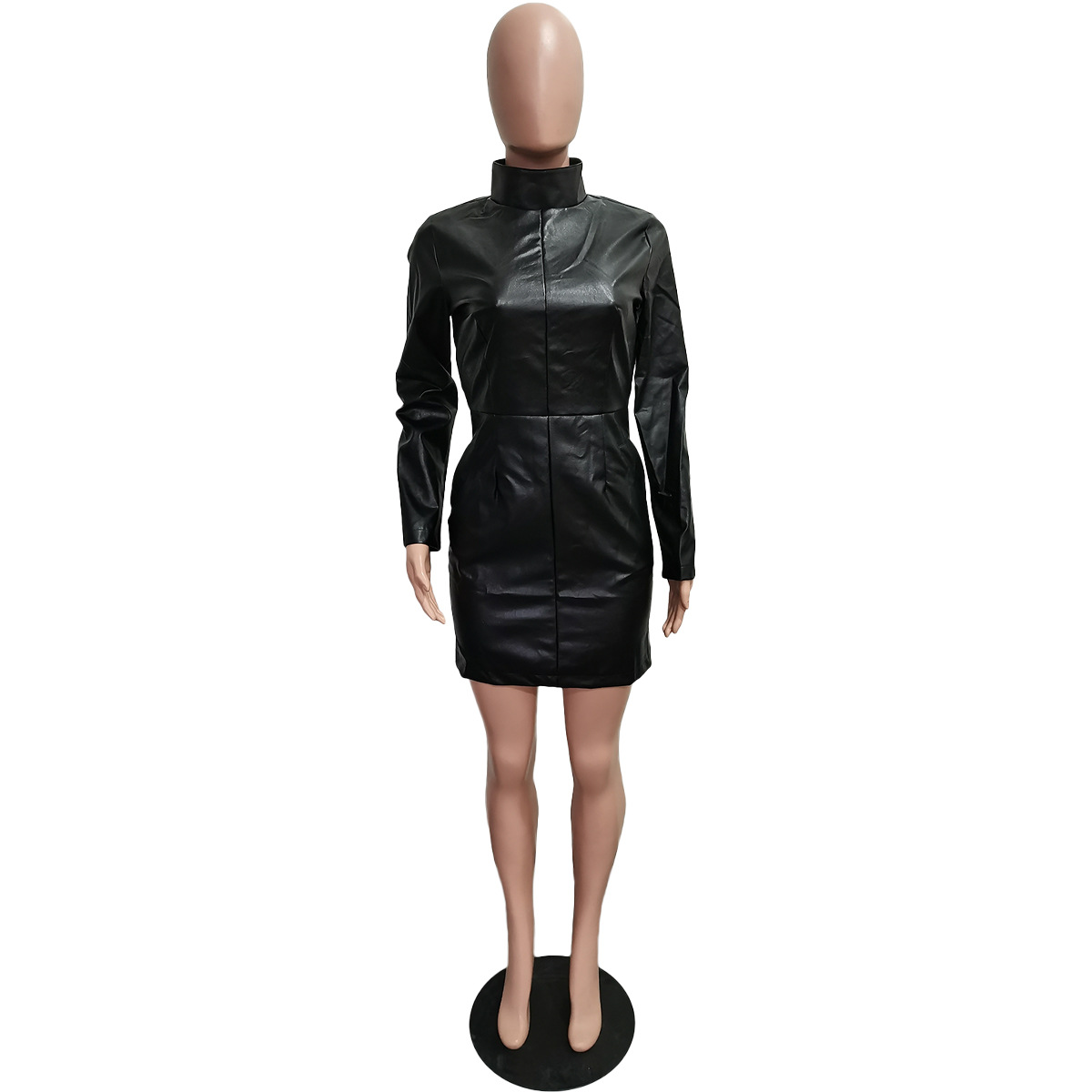 Women Clothing Spring Solid Color Faux Leather Long Sleeve Pocket Zipper Dress