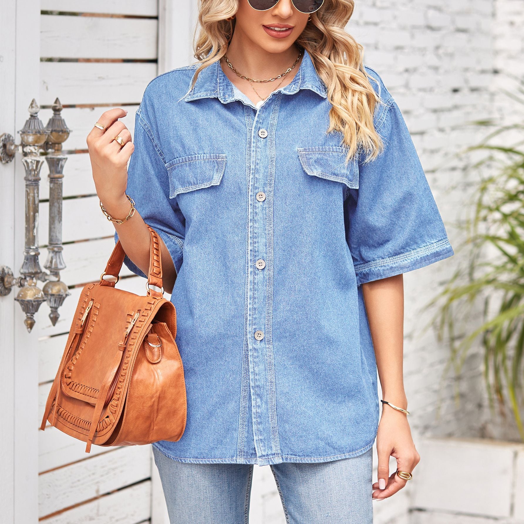 Women Clothing Trade Denim One Breasted Short Sleeve Casual Shirt Women