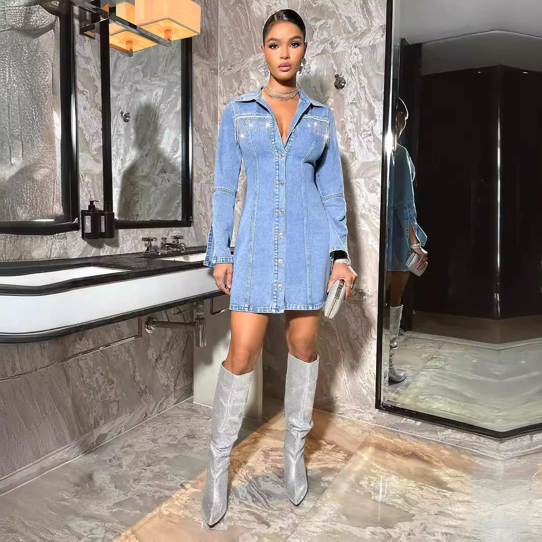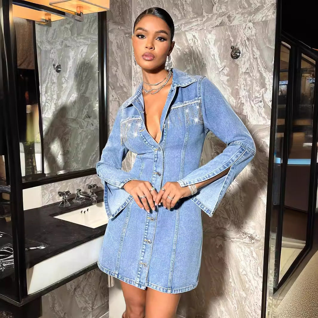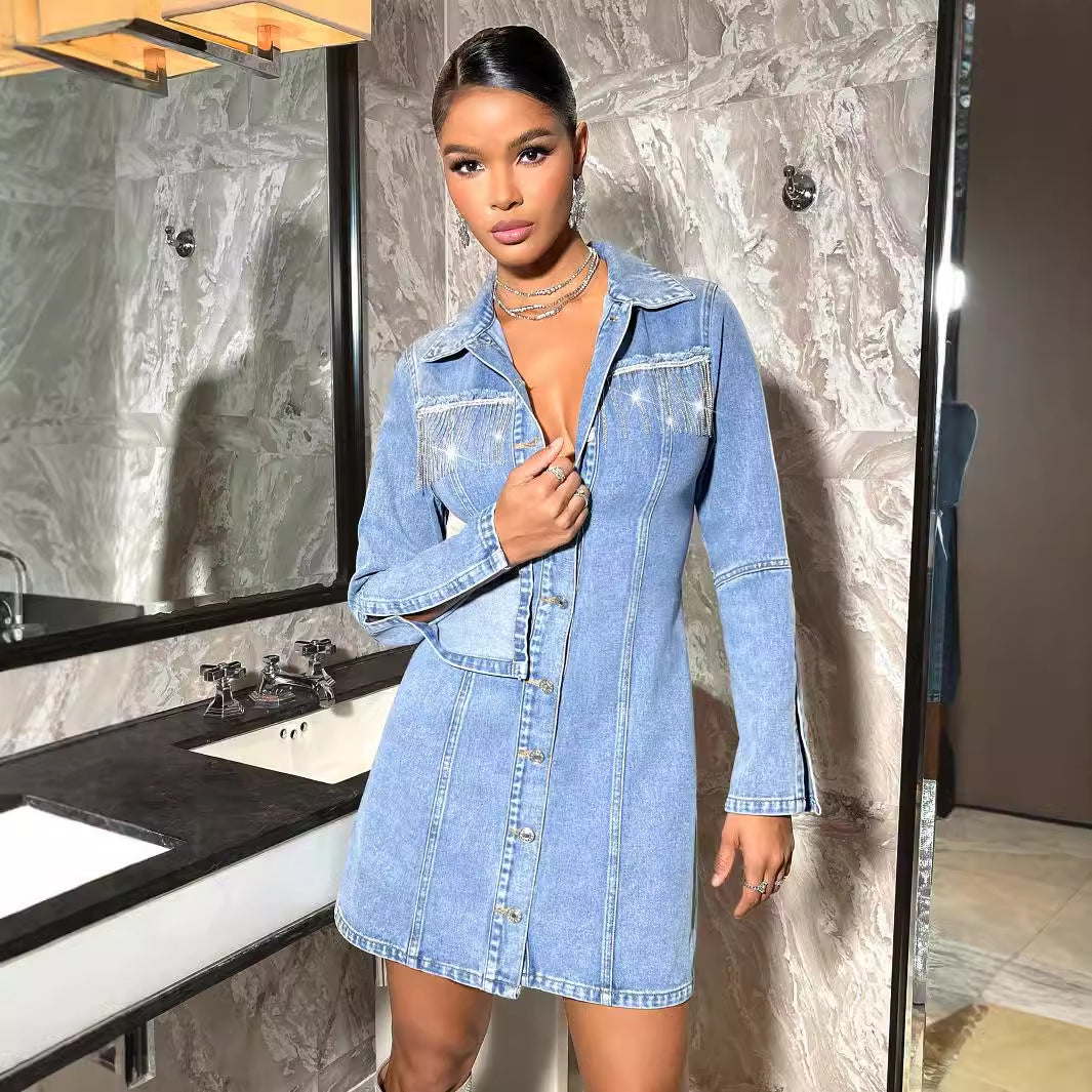 Women Clothing Waist Controlled Slimming Long Sleeve Denim Tassel Dress