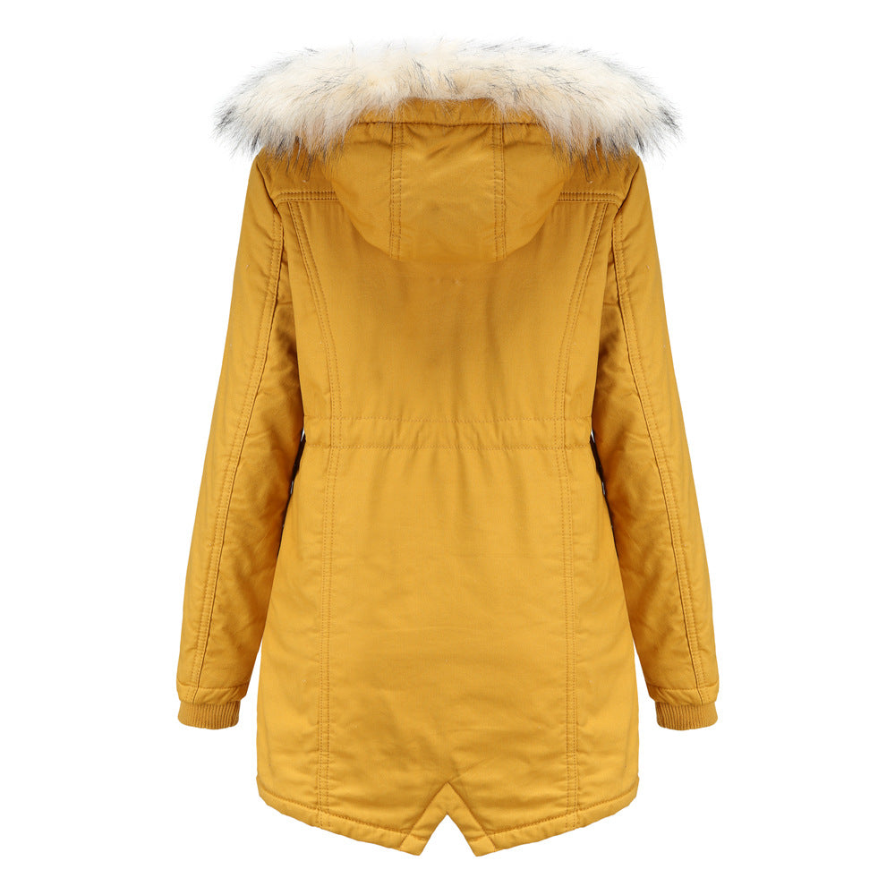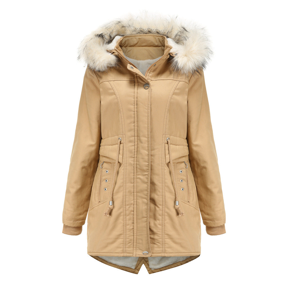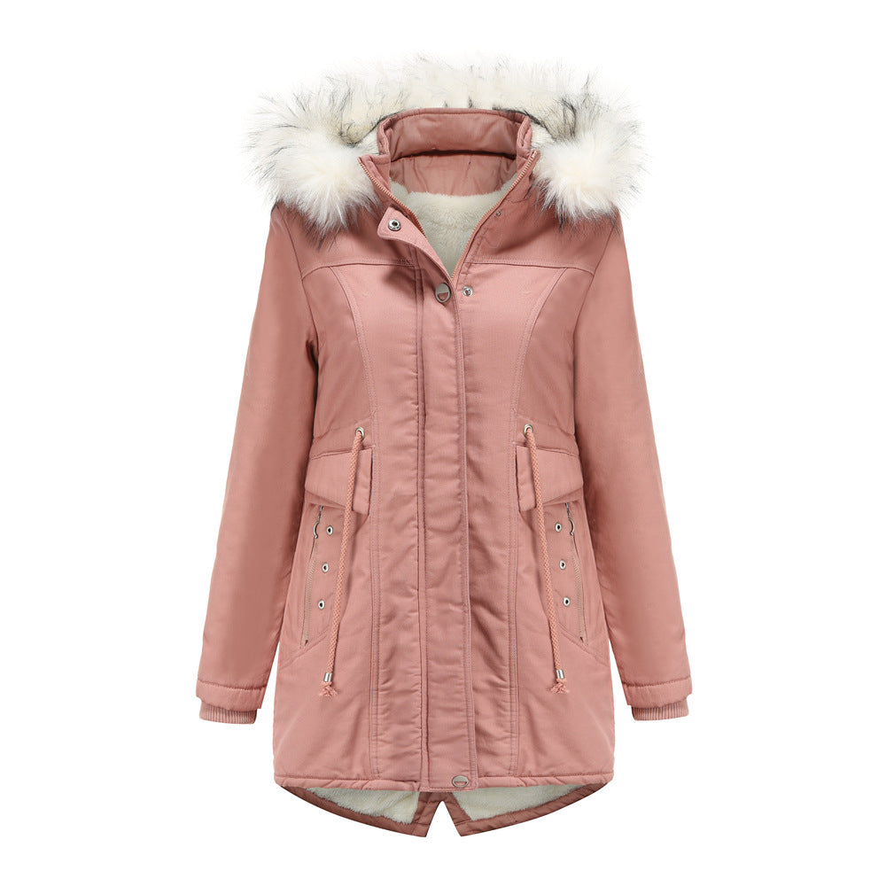 Women Cotton-Padded Clothes Fleece Mid-Length Detachable Hat Fur Collar Winter Warm Fleece Overcoat Woman Plus Size
