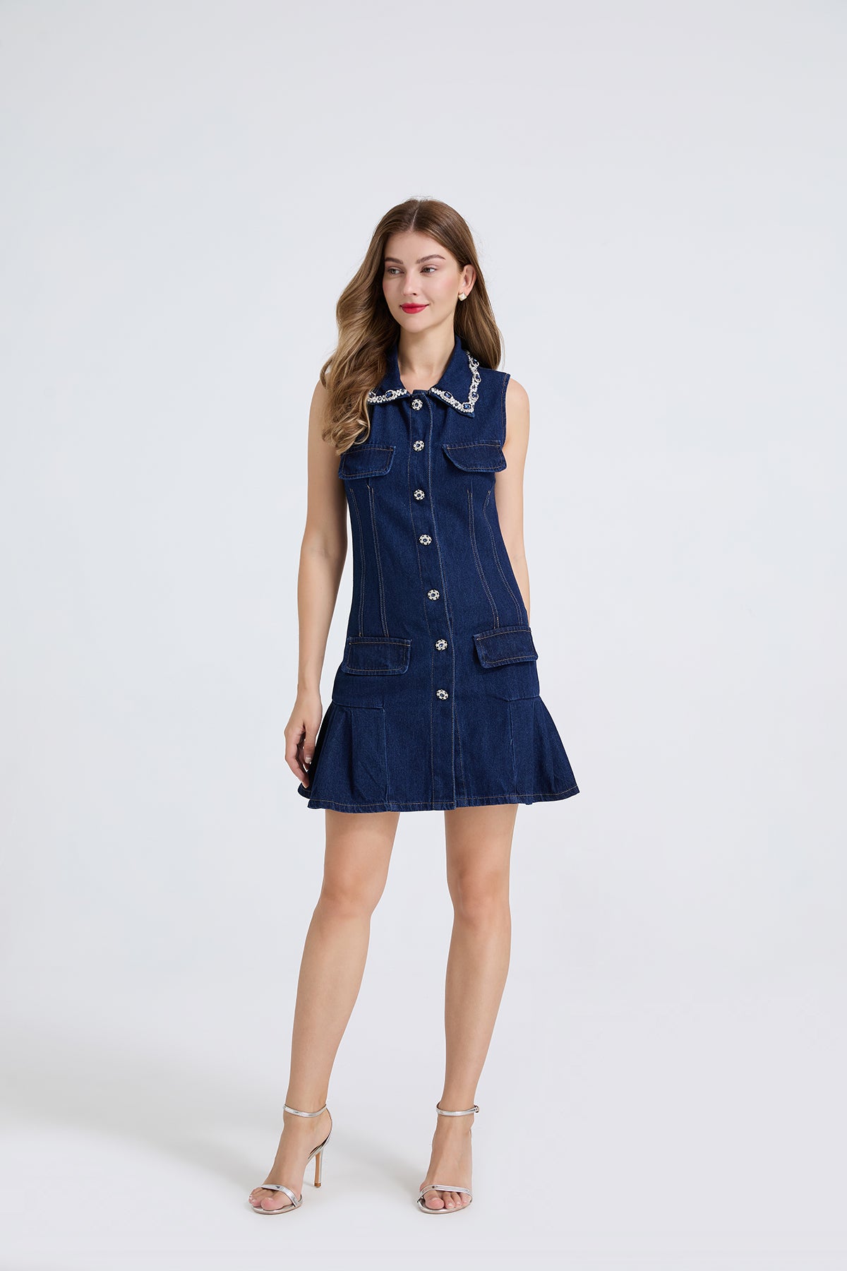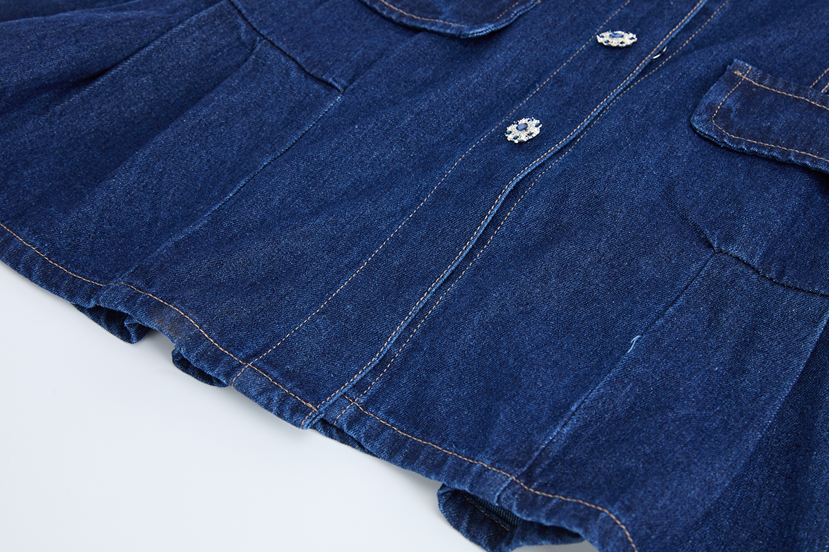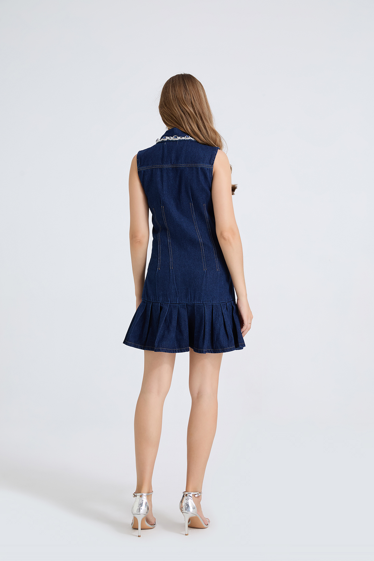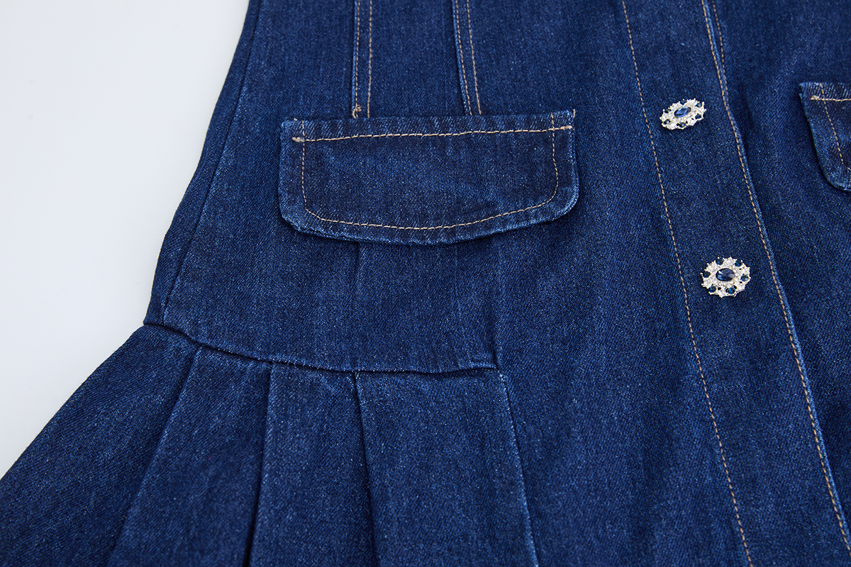 Women Diamond Studded Cinched Waist Pleated Denim Vest Dress Pure Cotton Figure Hugging Dress