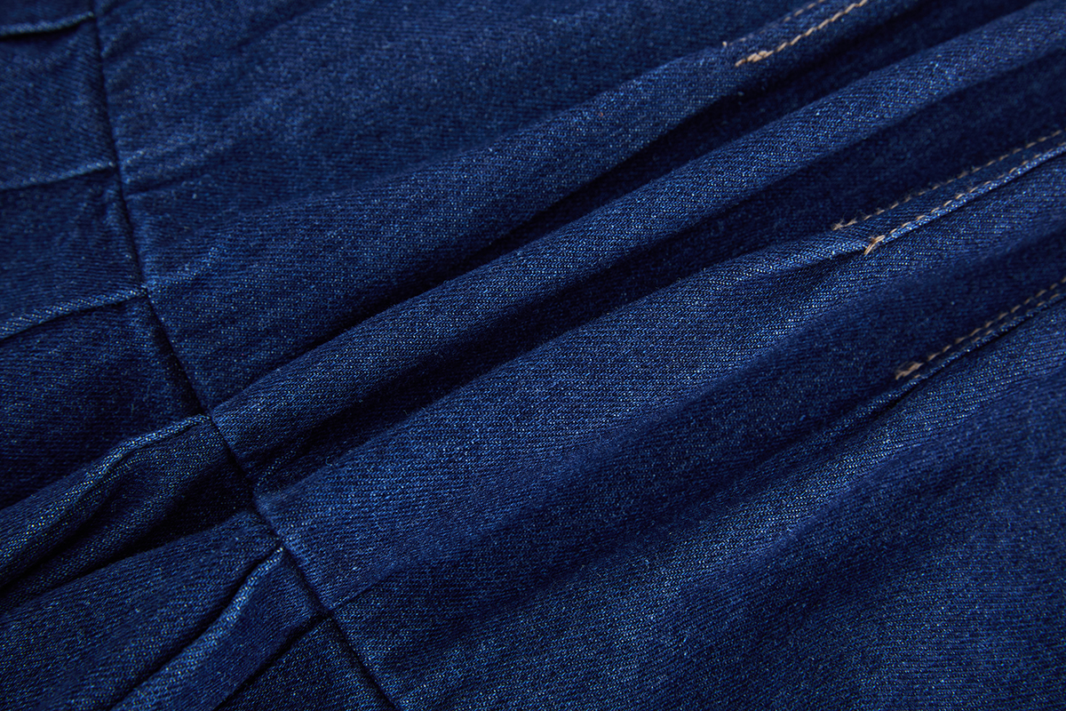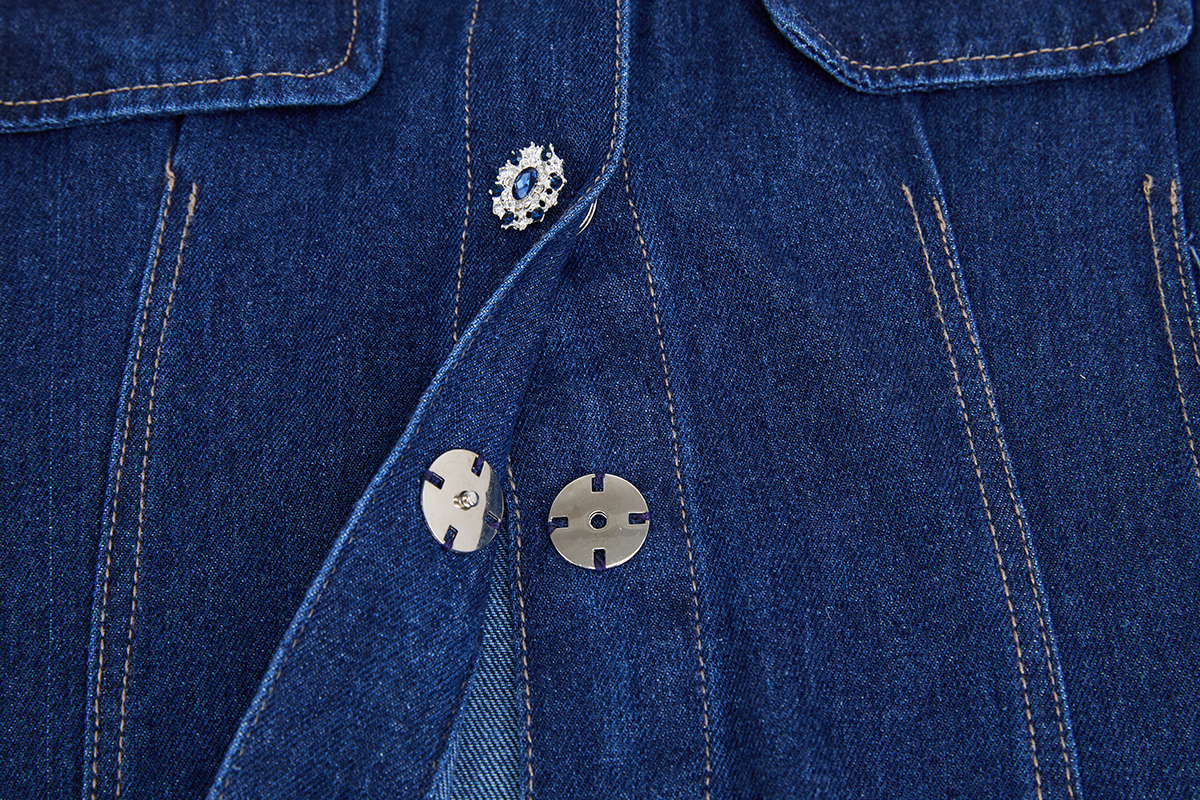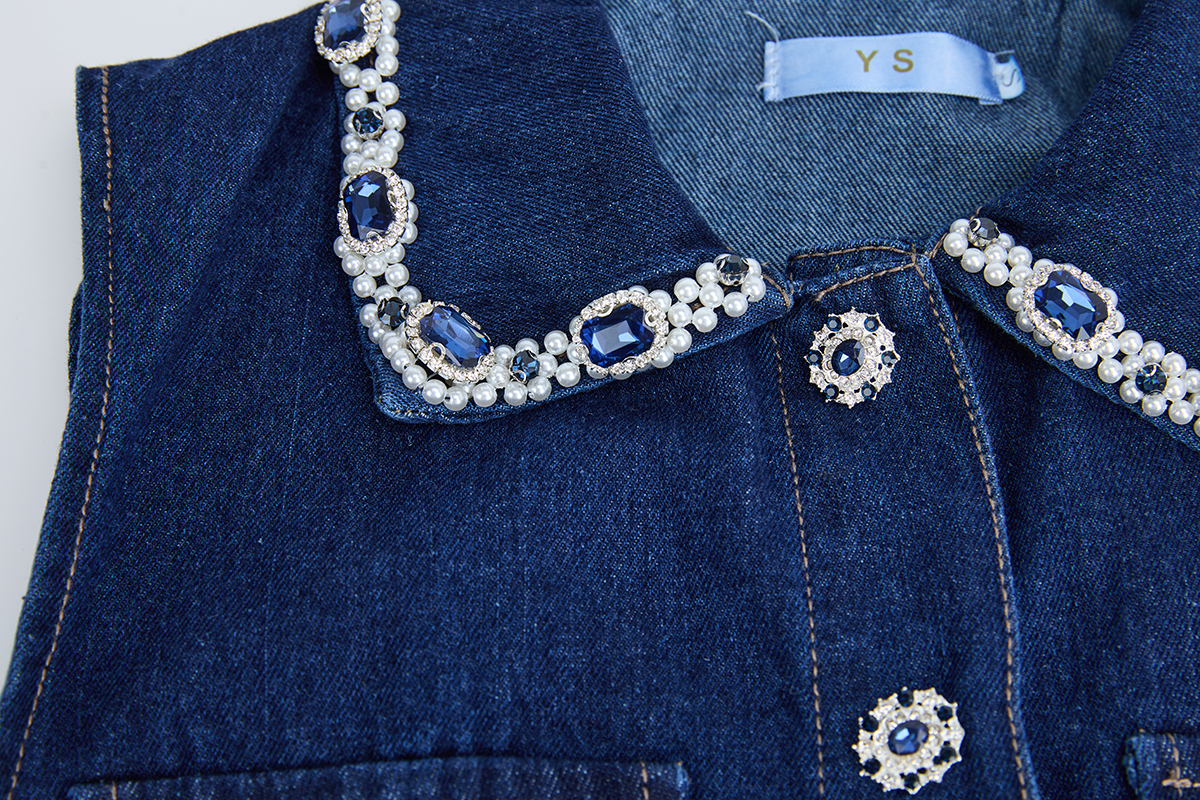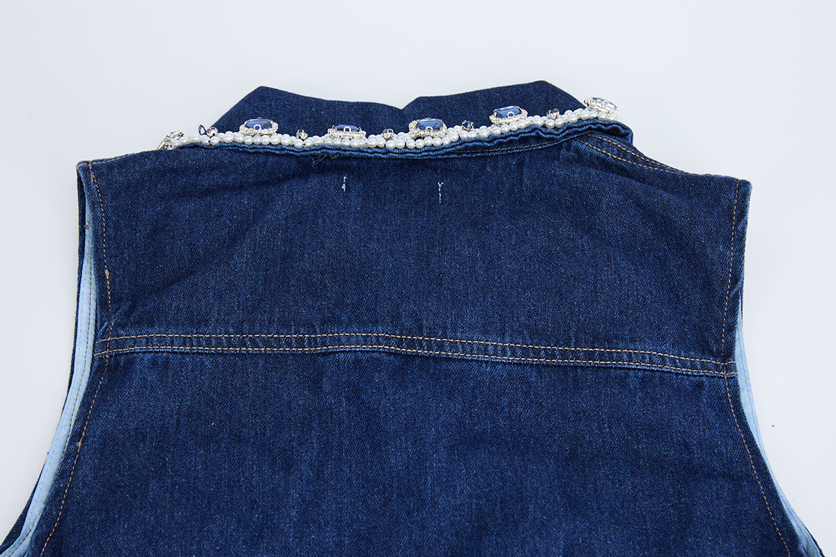 Women Diamond Studded Cinched Waist Pleated Denim Vest Dress Pure Cotton Figure Hugging Dress
