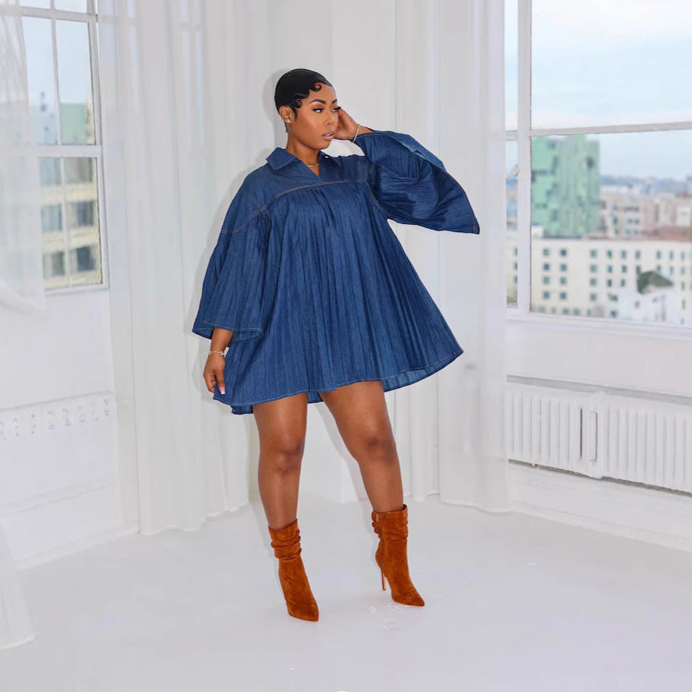 Women Elegant Loose Denim Row Pleated Stitching Women Clothing Dress