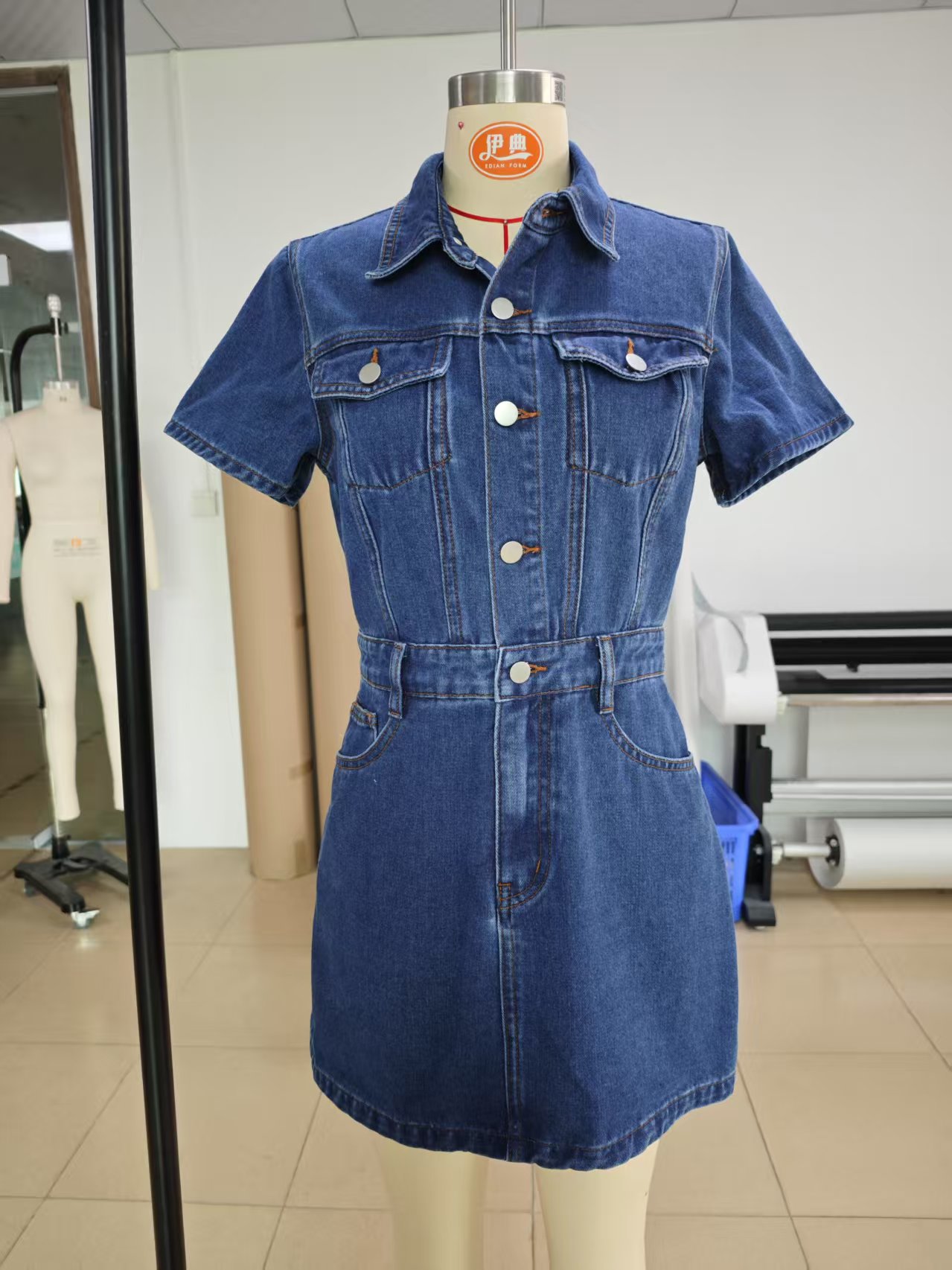 Women Elegant Washed Denim Waistline Non Elastic Denim Dress