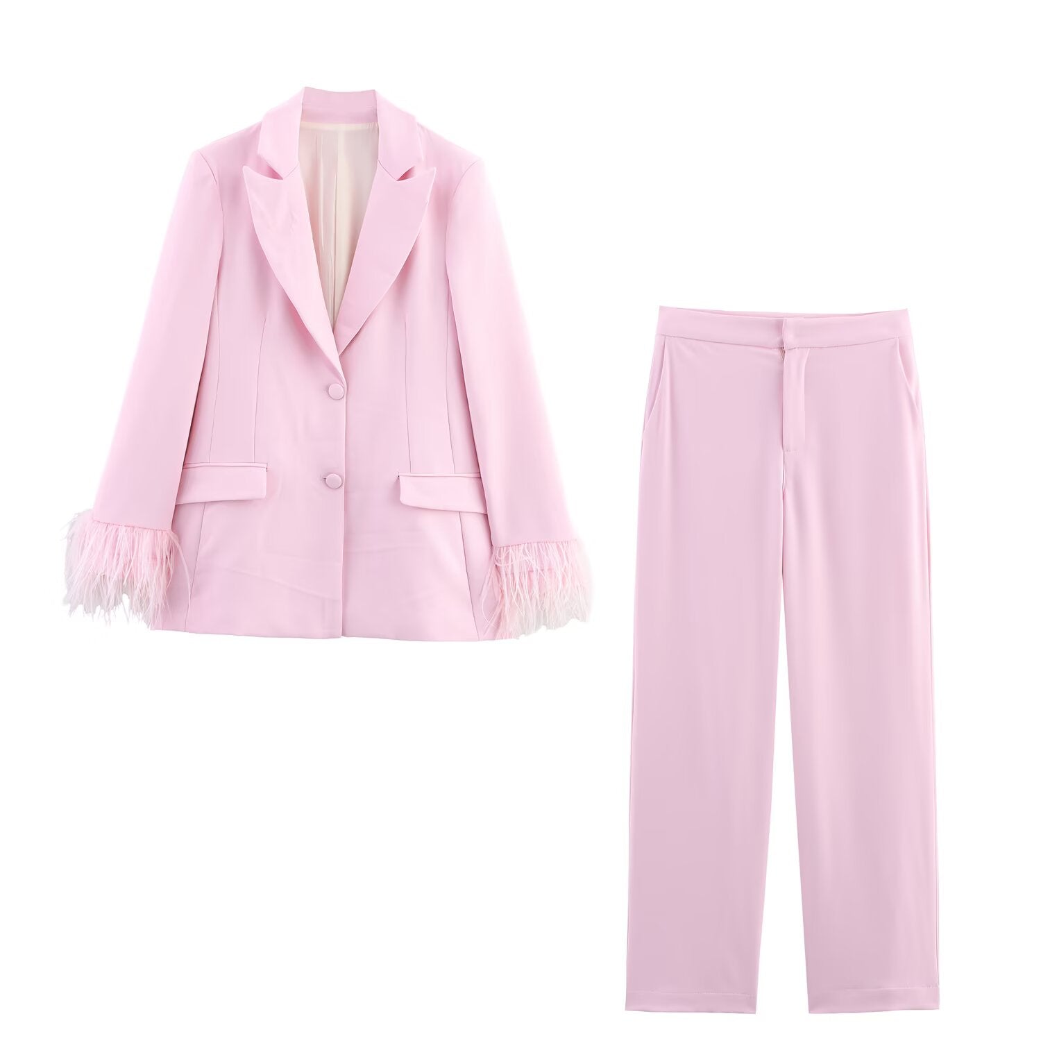 Women Feather Cuff Blazer Elegant Straight Leg Trousers Sets