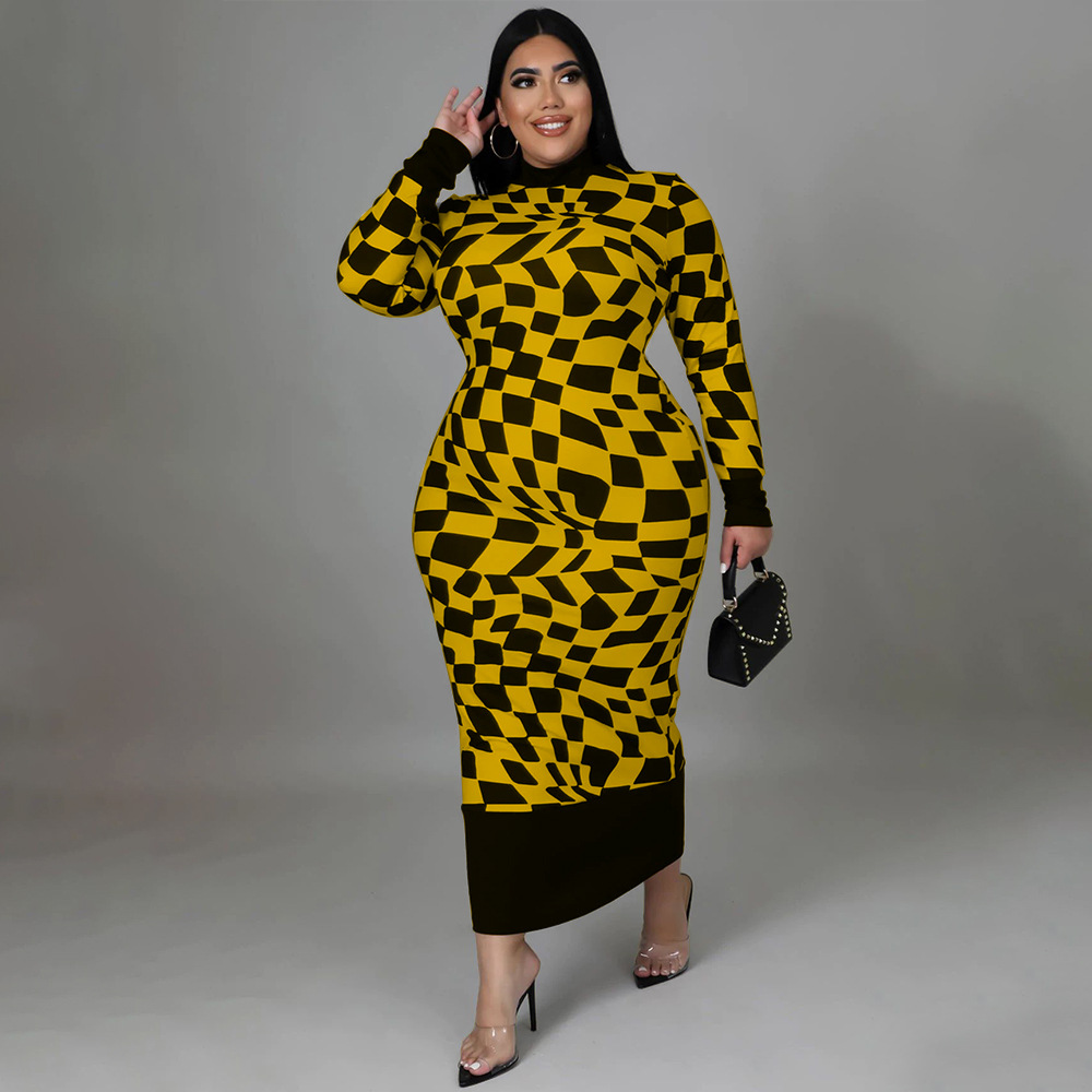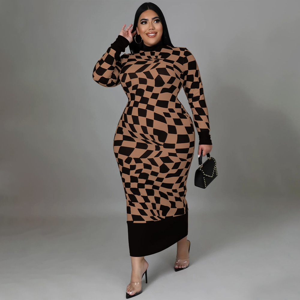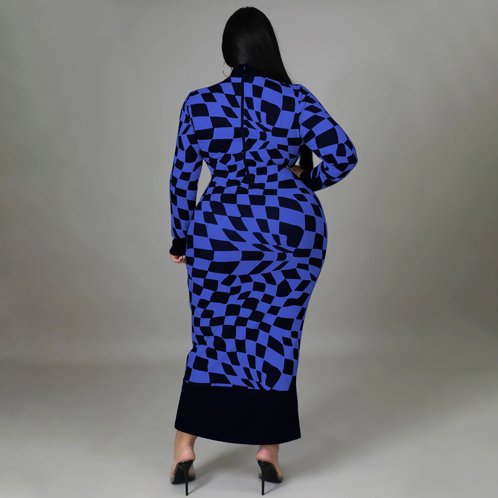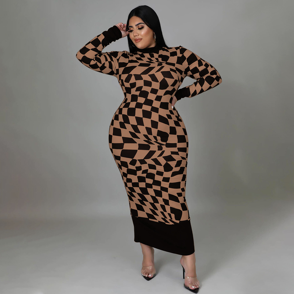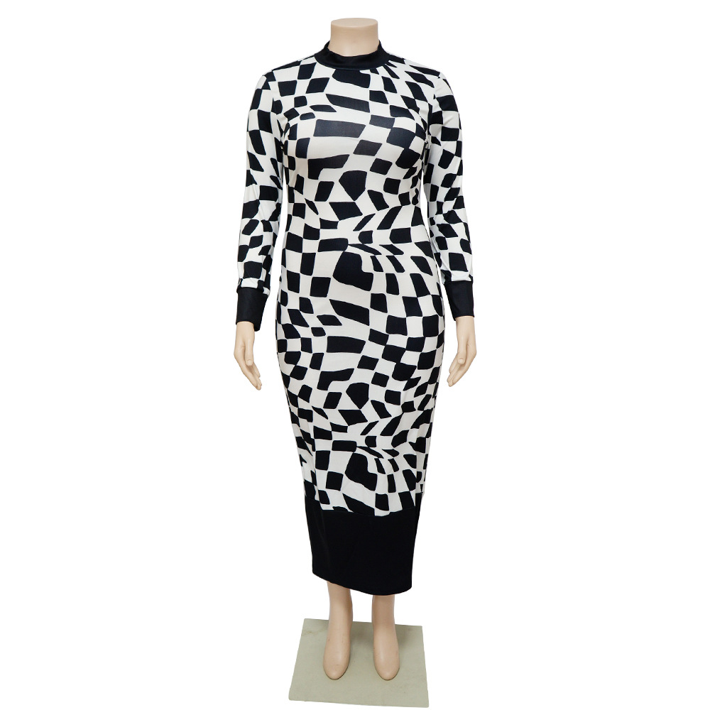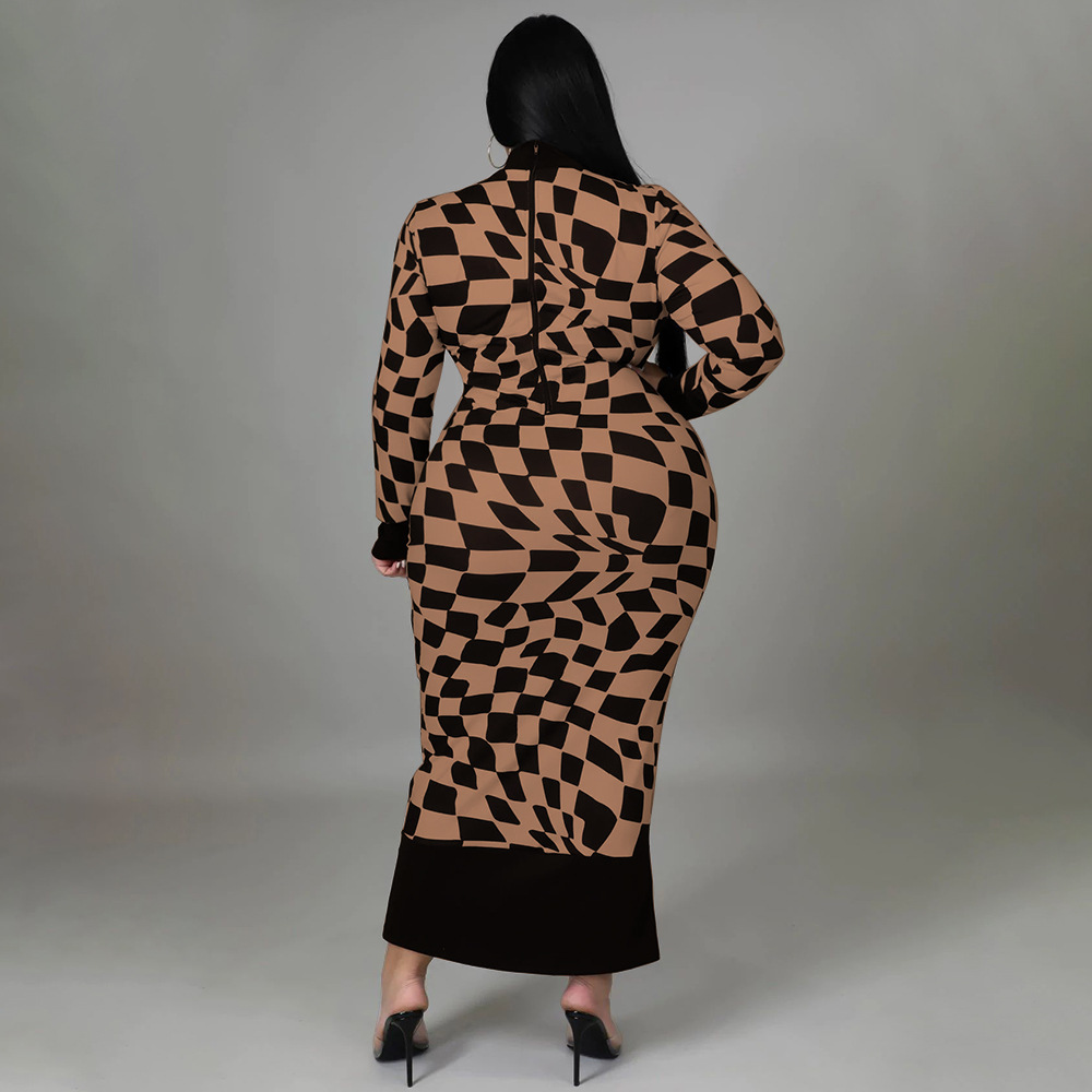 Women Round Neck Plaid Printed Long Sleeved Elegant Dress