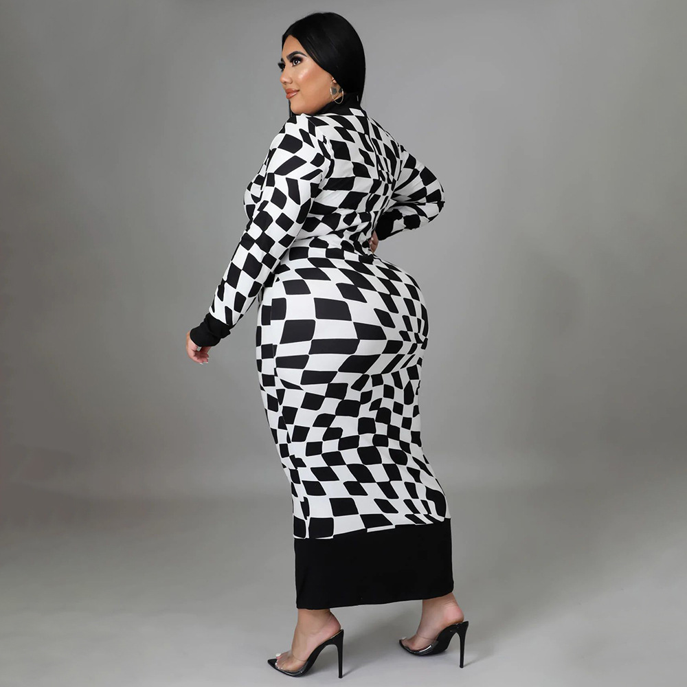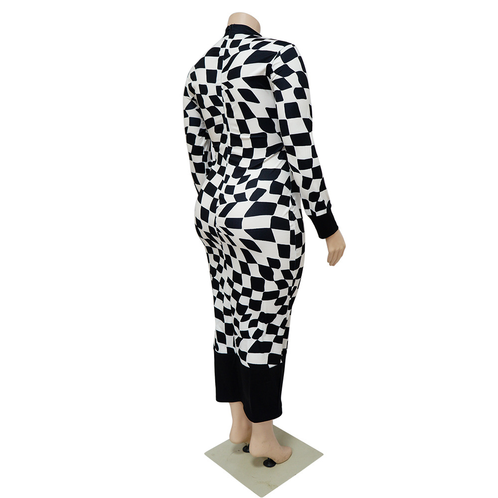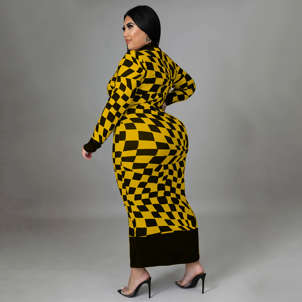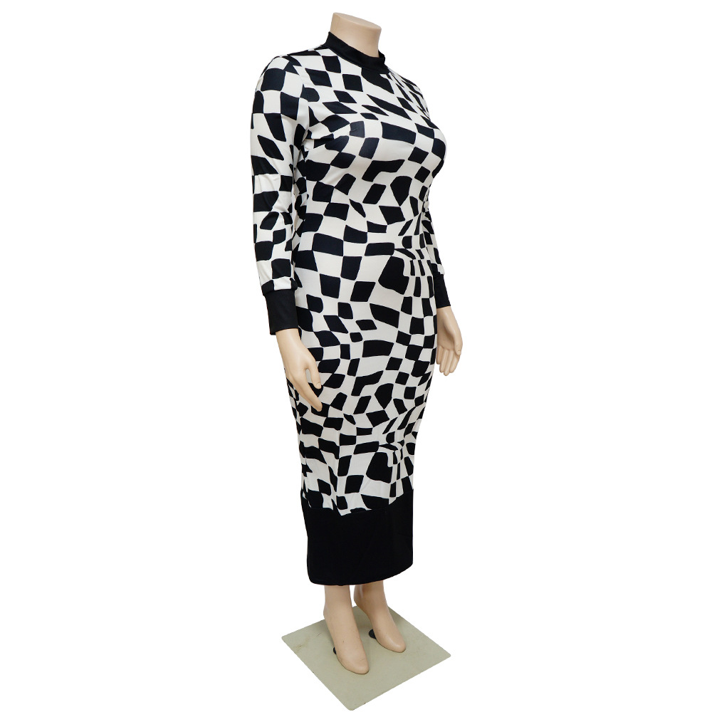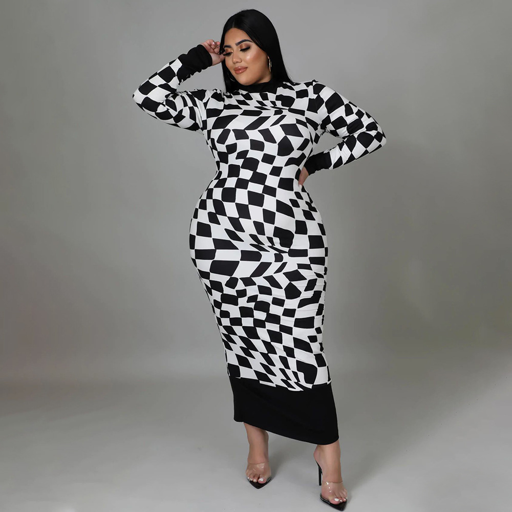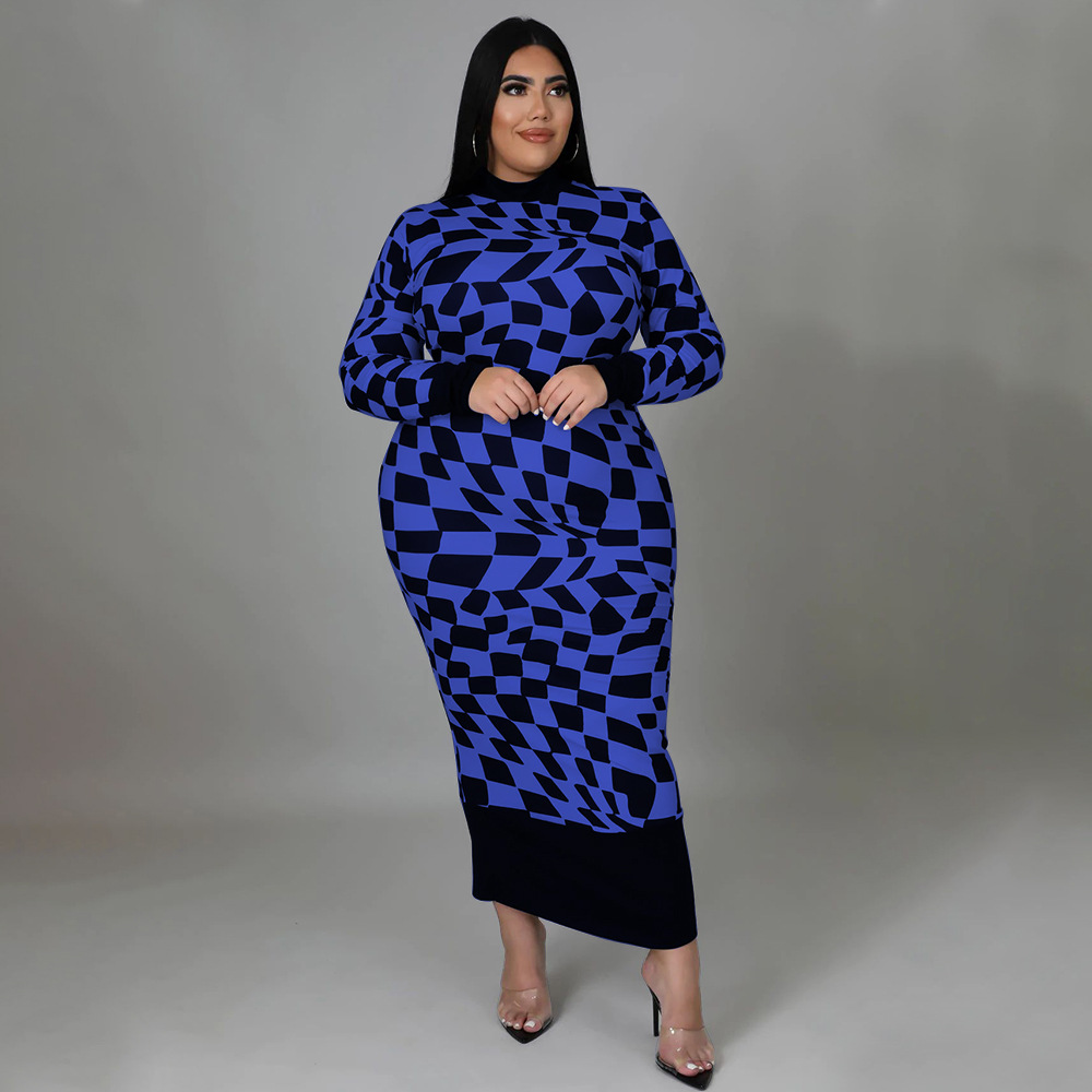 Women Round Neck Plaid Printed Long Sleeved Elegant Dress