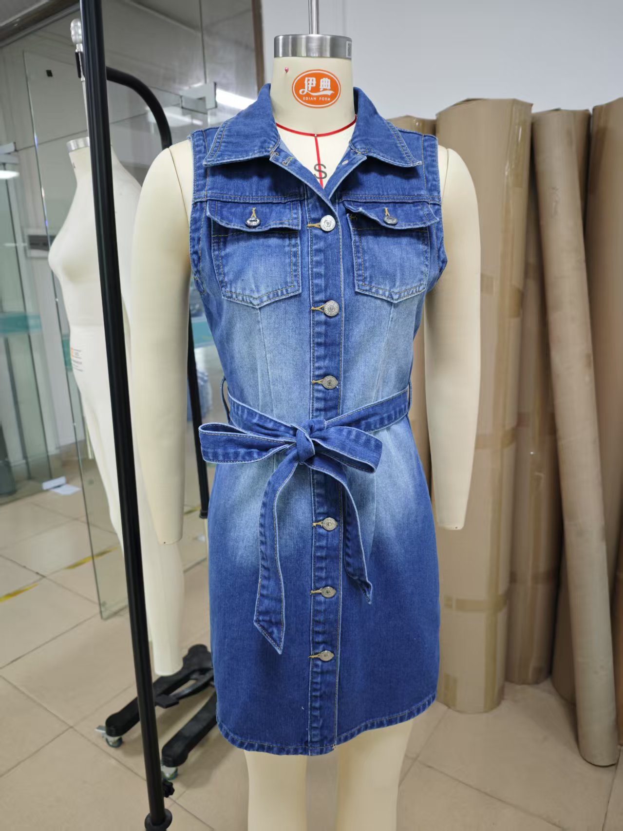 Women Shirt Dress Sleeveless Lace up Full Cardigan Denim Midi Dress