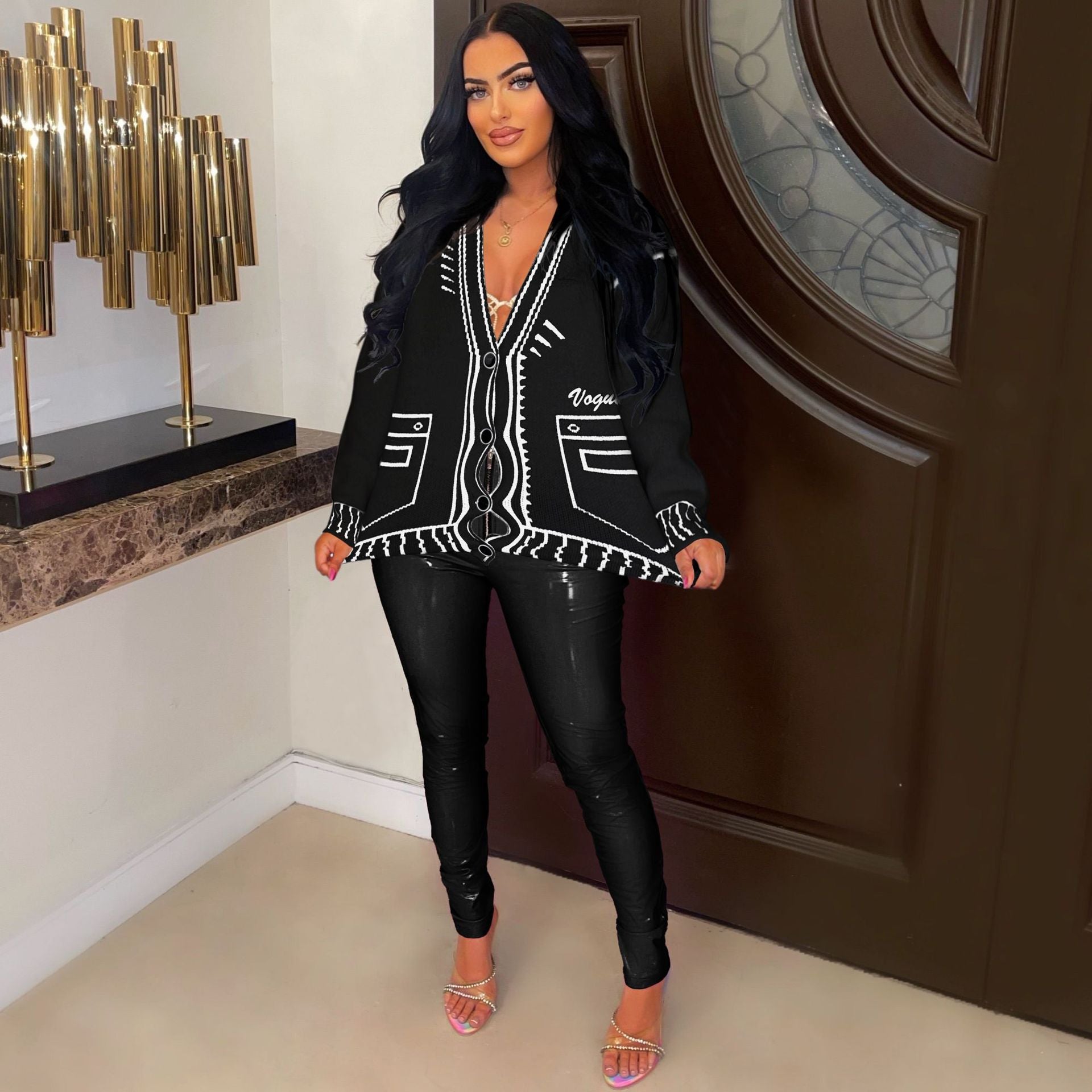 Women Sweater Black White Profile Painting Graffiti Loose Idle Cardigan Coat Knitted Top