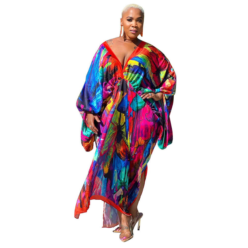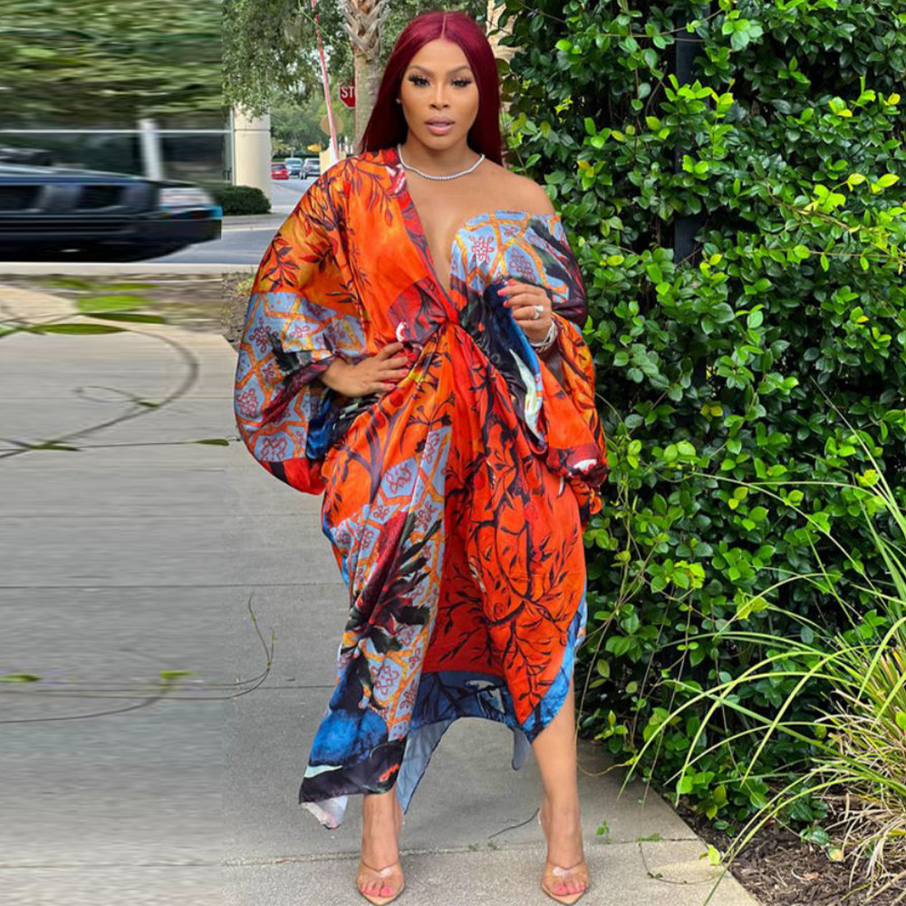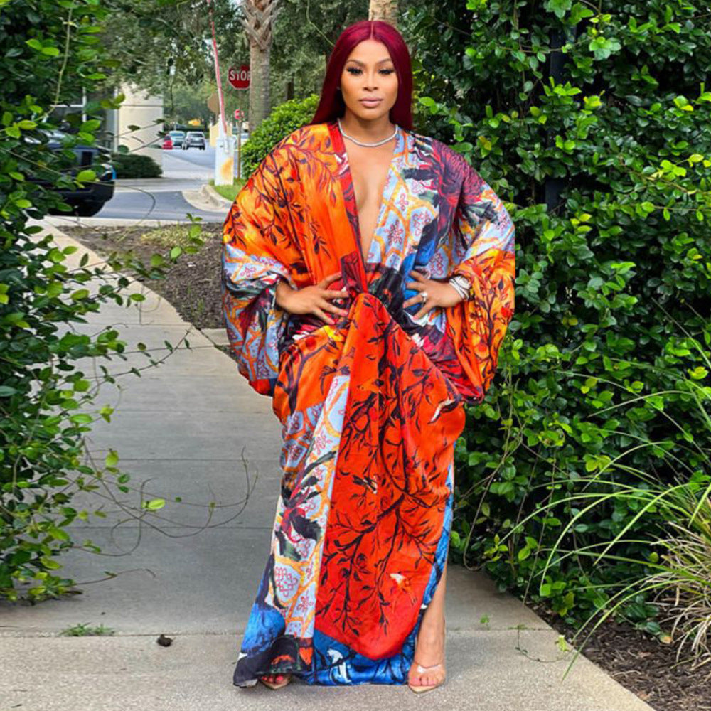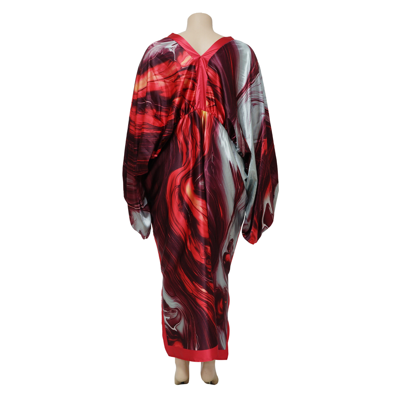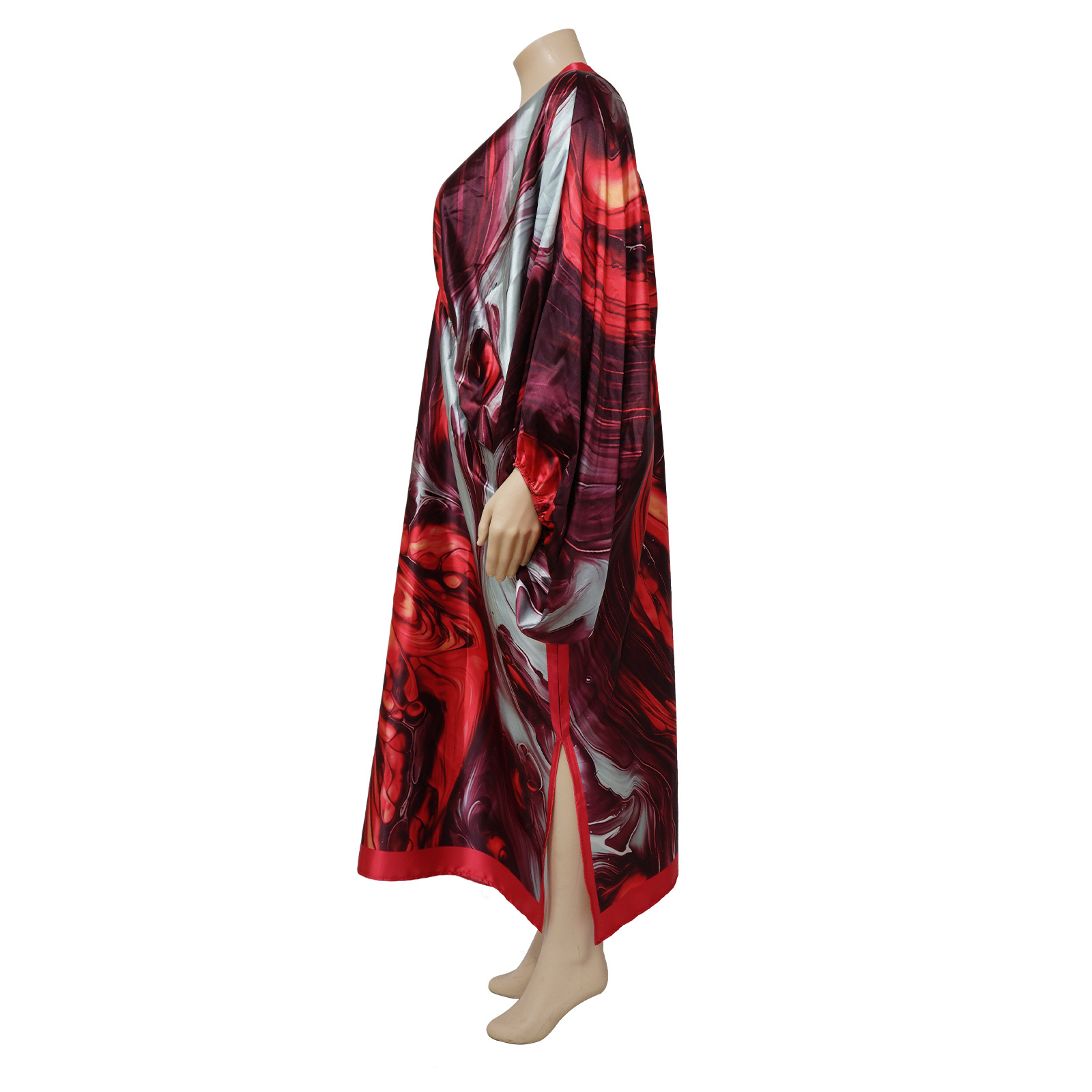 Women V Neck Dress Long Sleeve Silk Printed Dress