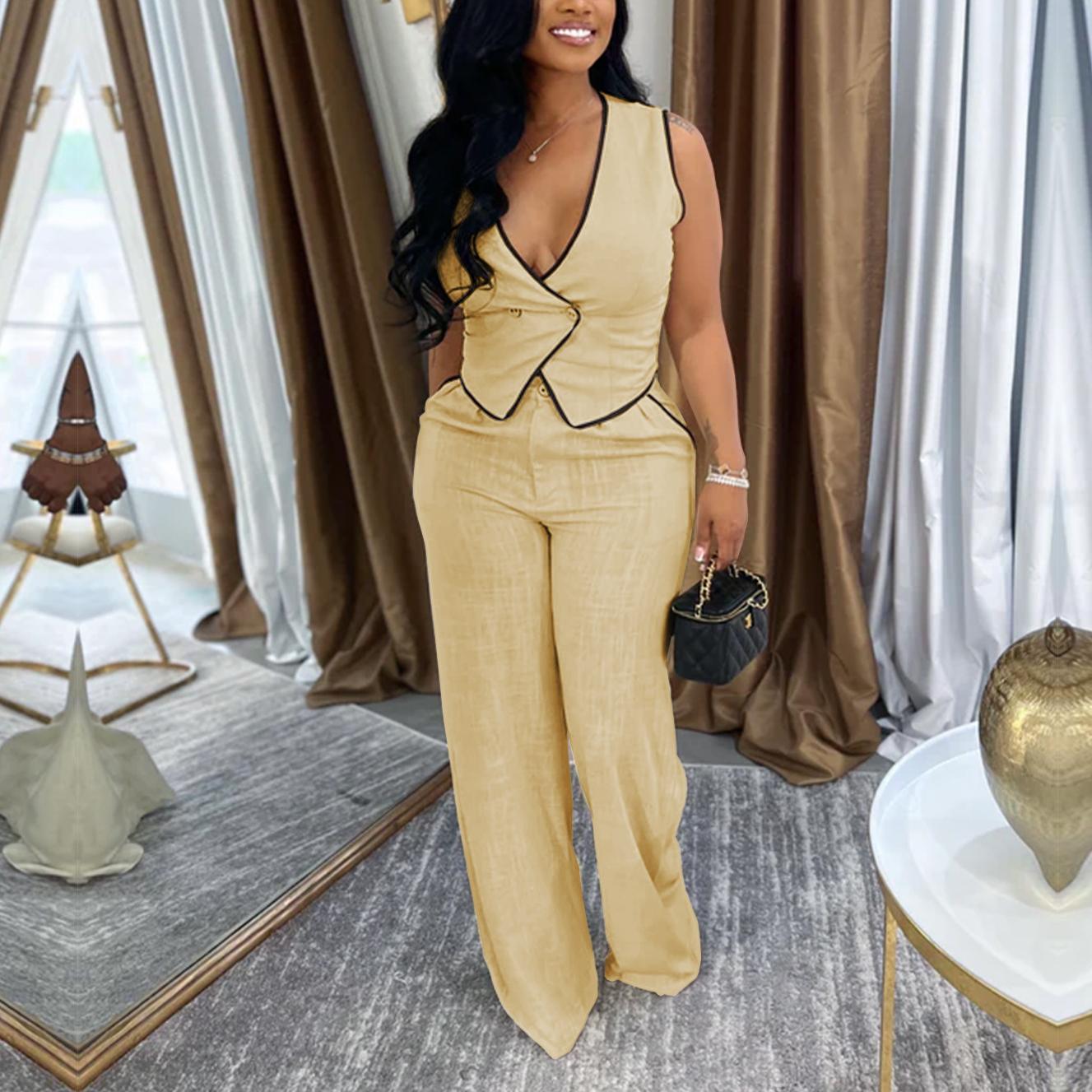 Women Wear Casual V neck Button Top Pants Two Piece Set